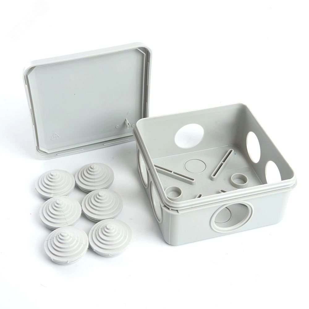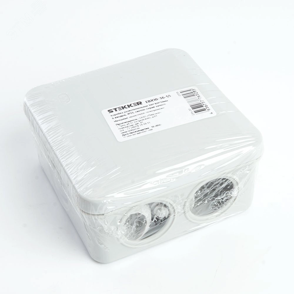 Разветвительная коробка STEKKER EBX10-36-55, количество вводов: 6, пластик, цвет светло-серый, размер 100*100*50мм. со степенью защиты IP 55. Разветвительная коробка STEKKER предназначена для изолирования точек отвода электропроводов, электрокабеля сетей освещения и энергосиловых сетей, напряжением до 1000В переменного и постоянного тока, а также кабелей информационных сетей (телефонных, компьютерных, сетей связи и пр.) Коробки используются при открытом монтаже электропроводки.