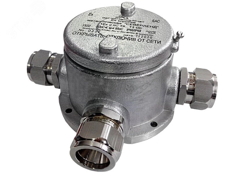 Ех коробка металлическая СЕВЕРЛЕНД предназначена для соединения (разветвления) сигнальных кабелей, например в шлейфах сигнализации, линиях связи и телекоммуникаций, цепях в системах управления и автоматики, а также подключения в шлейфы оконечных устройств, например датчиков сигнализации, абонентских устройств систем связи и т. п.