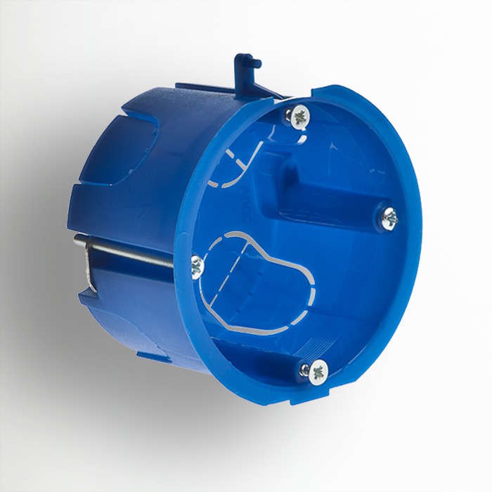 Монтажная коробка круглой формы, глубиной 40 мм, изготовлена из пластика, ярко-синего цвета.