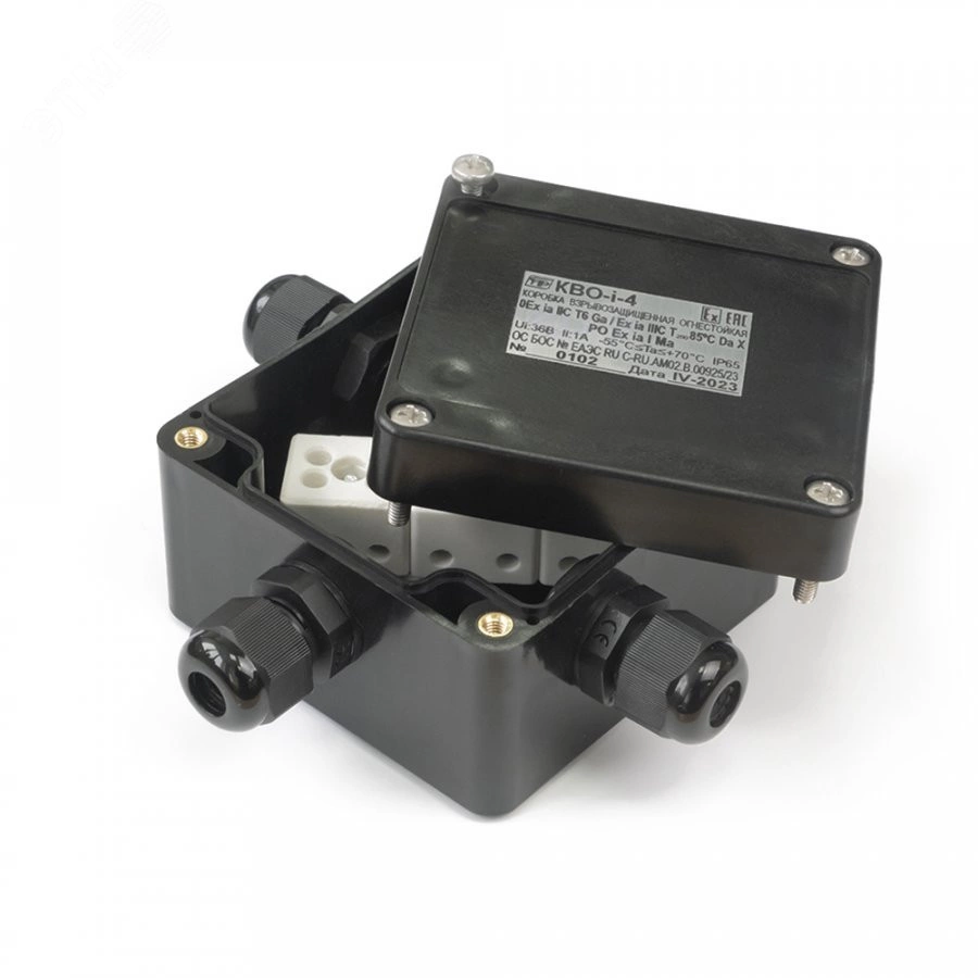 Коробки взрывозащишенные огнестойкие КВО изготовлены из антистатического армамида. Данные КВО предназначены для применения в составе огнестойкой кабельной линии при выполнении соединений (разветвлений) сигнальных или силовых цепей. Взрывозащищенность армамидных коробок КВО обеспечивается видом взрывозащиты ''искробезопасная цепь ''i'', с маркировкой взрывозащиты ''0Ex ia IIC T6 Ga / Ex ia IIIC T85 C Da / РО Ex ia I Ma'' по ГОСТ 31610.0-2014 для применения во взрывоопасных газовых и пылевых средах. Они соединяются с кабелями круглого сечения наружным диаметром от 3 до 8 мм. Коробки комплектуются термостойкими керамическими клеммными колодками с винтовыми соединениями с максимальной рабочей температурой 1100 градусов. Коробки имеют исполнения на 1, 2, 3 и 4 кабельных ввода и отличаются типом колодки.