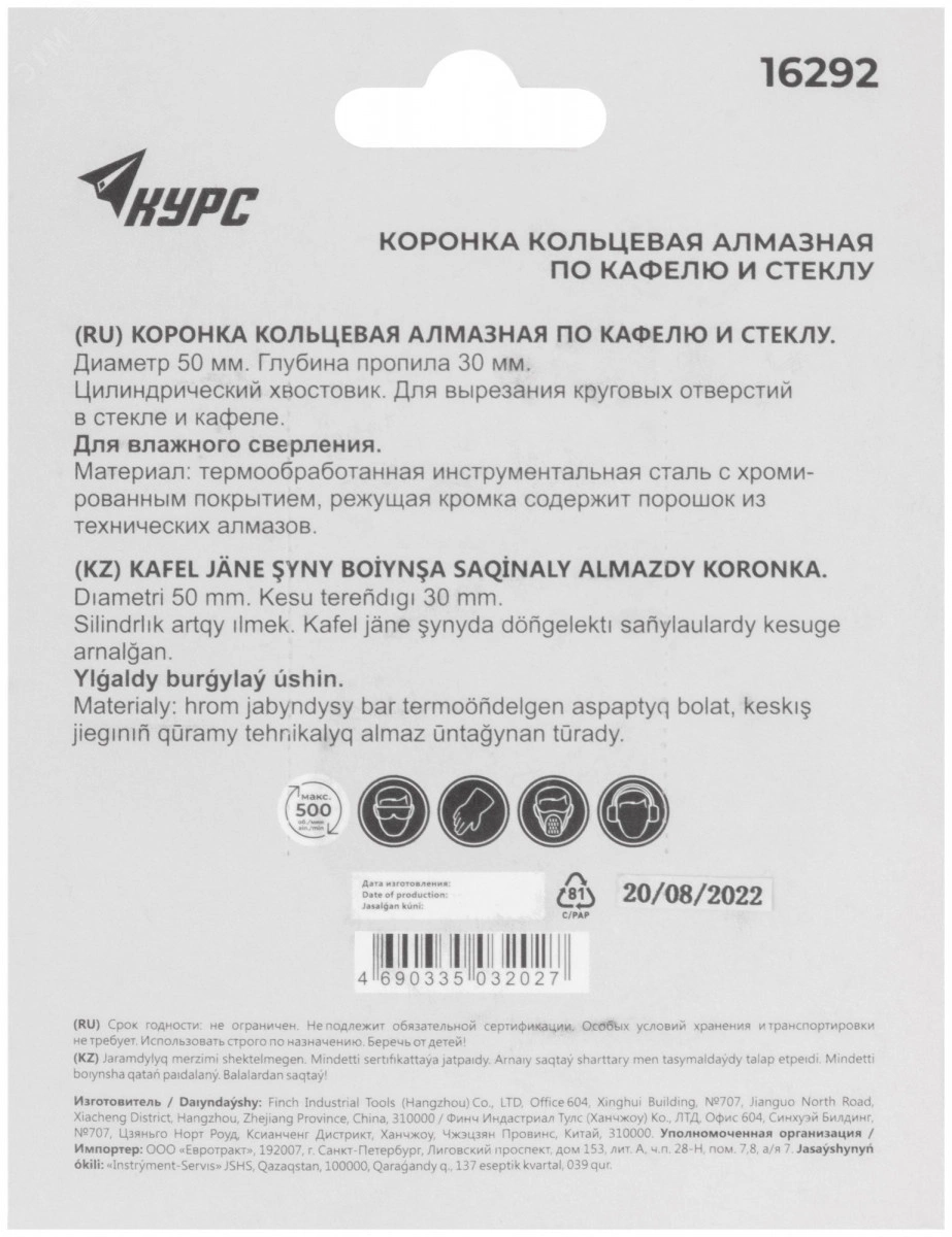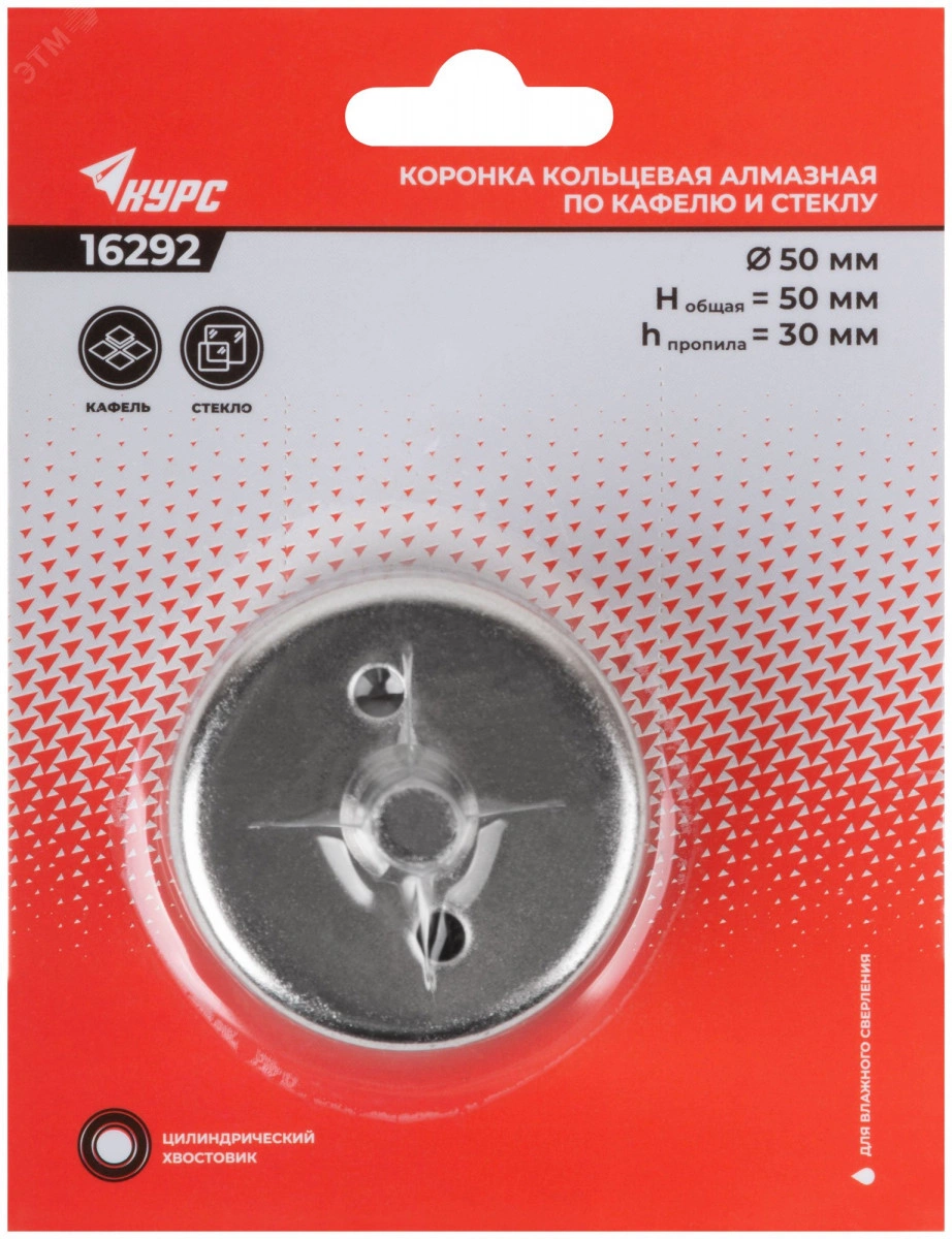 Коронка кольцевая по кафелю и стеклу алмазная 45х50 мм