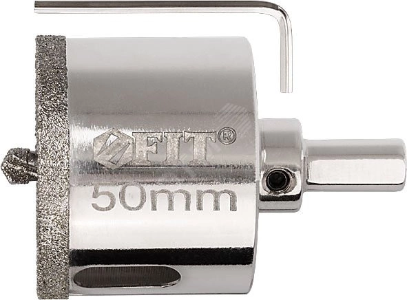 Трехгранный хвостовик. Идут в комплекте с центрирующим сверлом и шестигранным ключом. Для вырезания круговых отверстий в керамограните, камне, стекле, кафельной плитке. Влажное сверление. Глубина пропила 40 мм. Материал - инструментальная сталь, режущая кромка содержит порошок из технических алмазов. Упаковка - блистер.