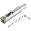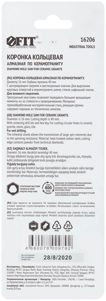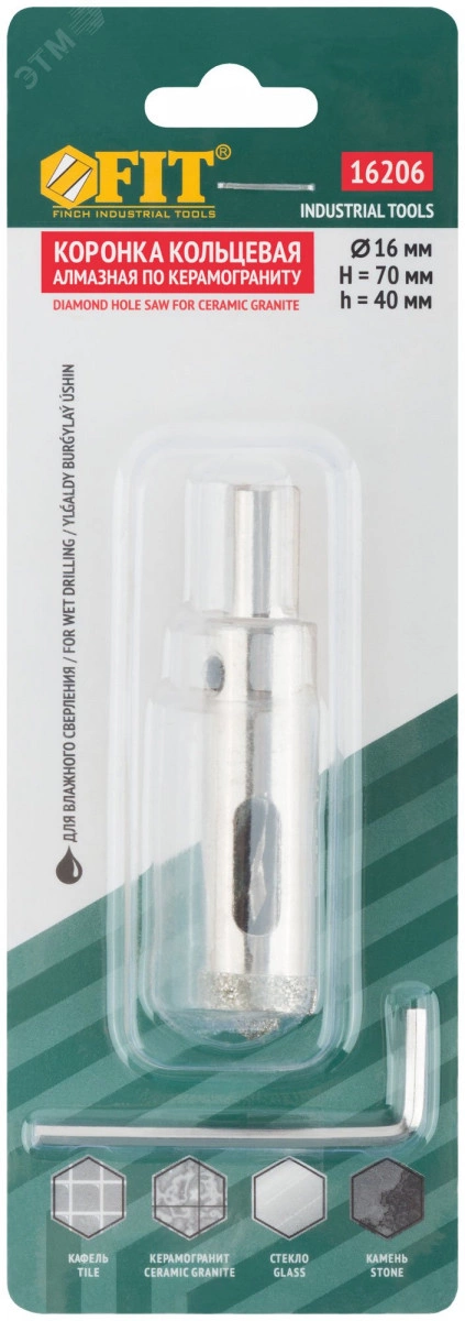 Кольцевая алмазная коронка по керамограниту FIT IT предназначена для вырезания круглых отверстий в керамограните, камне, стекле, кафельной плитке. Поставляются в комплекте с центрирующим сверлом и шестигранным ключом. Влажное сверление. Высокая концентрация алмазного зерна обеспечивает износостойкость и длительный ресурс коронок. Чистый рез без сколов достигается за счет мелкого размера алмазных частиц. Центрирующее сверло предотвращает смещение коронки во время работы и способствует точному позиционированию. Трехгранный хвостовик передает больший крутящий момент за счет стойкости к проворачиванию.