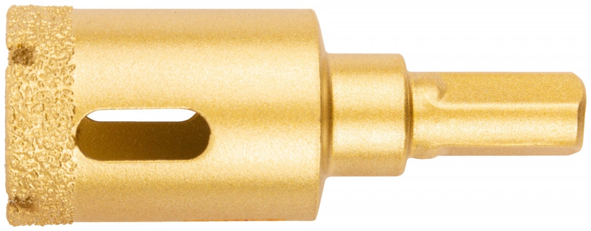 Профи. 16301-16306 - цилиндрический хвостовик, 16308-16310 - трехгранный хвостовик. Для вырезания круговых отверстий в керамограните, кафельной плитке, бетоне, граните, мраморе, камне, кирпиче и стекле. Влажное сверление. Глубина пропила 35 мм. Материал - инструментальная сталь, режущая кромка содержит порошок из технических алмазов. Упаковка - блистер.