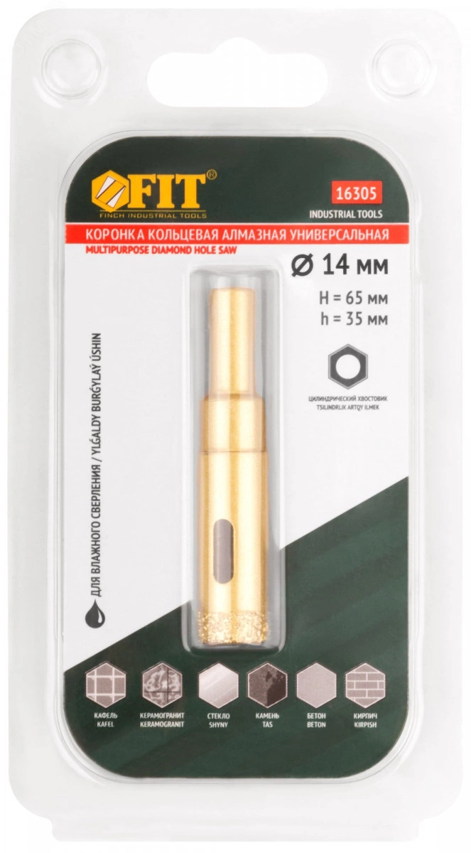 Кольцевая алмазная коронка по керамограниту FIT IT ''Профи'' предназначена для вырезания круглых отверстий в керамограните, камне, стекле, кафельной плитке. Влажное сверление. Глубина пропила — 35 мм. Высокая концентрация алмазного зерна обеспечивает износостойкость и длительный ресурс коронок. Чистый рез без сколов достигается за счет мелкого размера алмазных частиц. Отверстия в корпусе коронок способствуют эффективному охлаждению и отводу шлама. Цилиндрический хвостовик совместим с большинством патронов электроинструмента.
