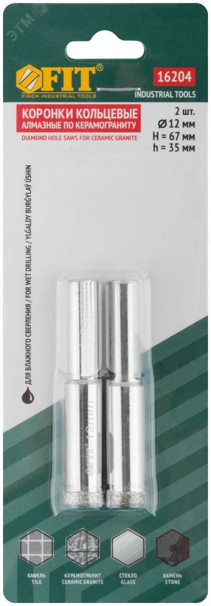 Коронки кольцевые по керамограниту, камню и кафелю алмазные, набор 2 шт, 12х67 мм
