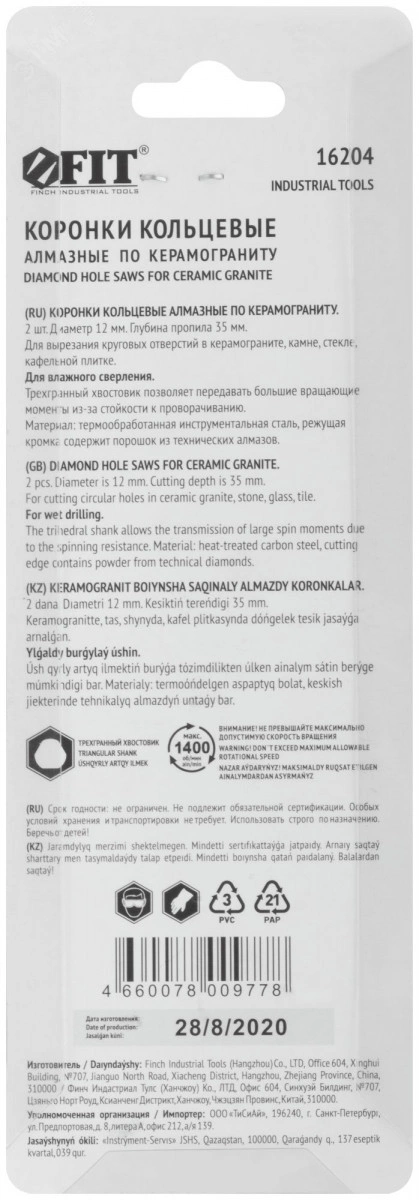 Кольцевая алмазная коронка по керамограниту FIT IT предназначена для вырезания круглых отверстий в керамограните, камне, стекле, кафельной плитке. Влажное сверление. Высокая концентрация алмазного зерна обеспечивает износостойкость и длительный ресурс коронок. Чистый рез без сколов достигается за счет мелкого размера алмазных частиц. Трехгранный хвостовик передает больший крутящий момент за счет стойкости к проворачиванию.