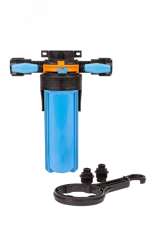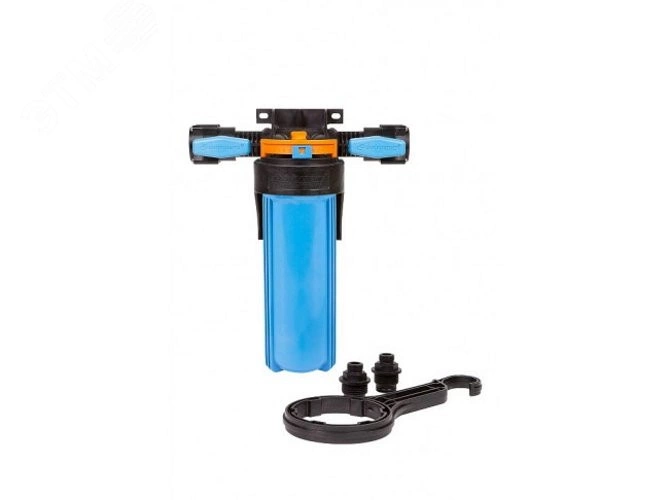 Корпус для картриджного фильтра предназначен для размещения в нём картриджей или фильтрующей засыпки для дальнейшей очистки холодной воды в бытовых условиях. Типоразмер колбы - SlimLine 10. Поворот коллектора на 180град позволяет установить корпус фильтра в магистраль, с направлением движения воды, как слева направо, так и справа налево. Магистральную трубу можно разместить вплотную к стене. Кронштейн является одним целым с крышкой корпуса фильтра. В корпусе предусмотрены специальные технологические отверстия (пробки) для сброса избыточного давления и слива остаточной воды. В комплект поставки входит ключ, с помощью которого можно отвернуть колбу от крышки, а также уплотнительная вставка белого цвета для картриджных элементов без сердечника. На концах коллектора встроены шаровые краны.