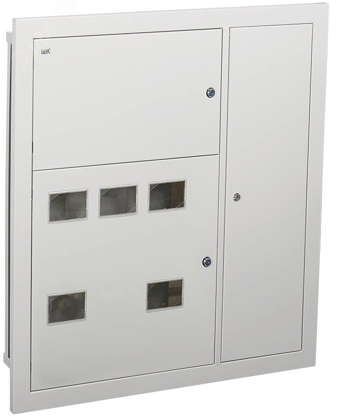 Используется для сборки этажного распределительного щита на 5 квартир, предназначенного для приема и распределения электроэнергии в жилых и общественных зданиях, а также для защиты отходящих линий при перегрузках и коротких замыканиях.Сварной металлический корпус состоит из трех отсеков - вводно-учетного, распределительного, отсека слаботочного оборудования. В вводно-учетном и распределительном отсеках размещены DIN-рейки для крепления счетчиков (по количеству квартир). В распределительном отсеке установлены DIN-рейки для аппаратов групповых линий и рейка для установки шин N и РЕ. Отсек укомплектован оперативной панелью. Отсек слаботочного оборудования снабжен перфорированными профилями для прокладки теле- и радиосетей, телефонных линий, сетей охранной сигнализации, домофонов и т.п. Для обеспечения пожарной безопасности между слаботочным и силовым отсеками расположена разделительная перегородка.