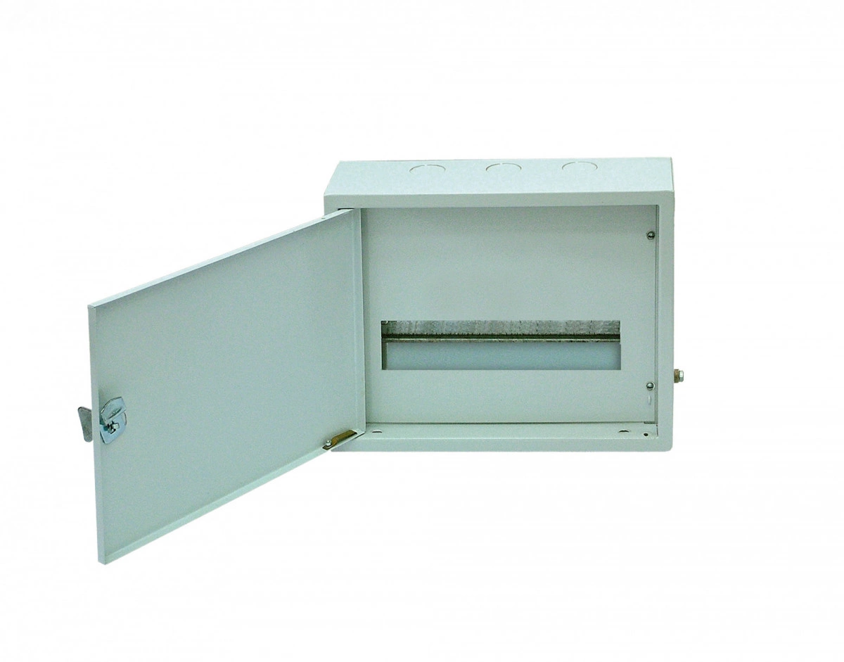 Щит распределения, навесной, с цельнометаллической дверкой, 12 модулей, установлены 2 шины по 14 отверстий. Отличительной особенностью корпусов распределения является применение омедненных шпилек вместо болтов в узлах заземления. Комплектуются фальш-панелью, DIN-рейками, а также шинами N и PE. Степень защиты корпусов не менее IP 31, а при открытой дверце IP 20 это позволяет устанавливать щиты в местах, доступных неквалифицированному персоналу. Порошковая окраска RAL 7035
