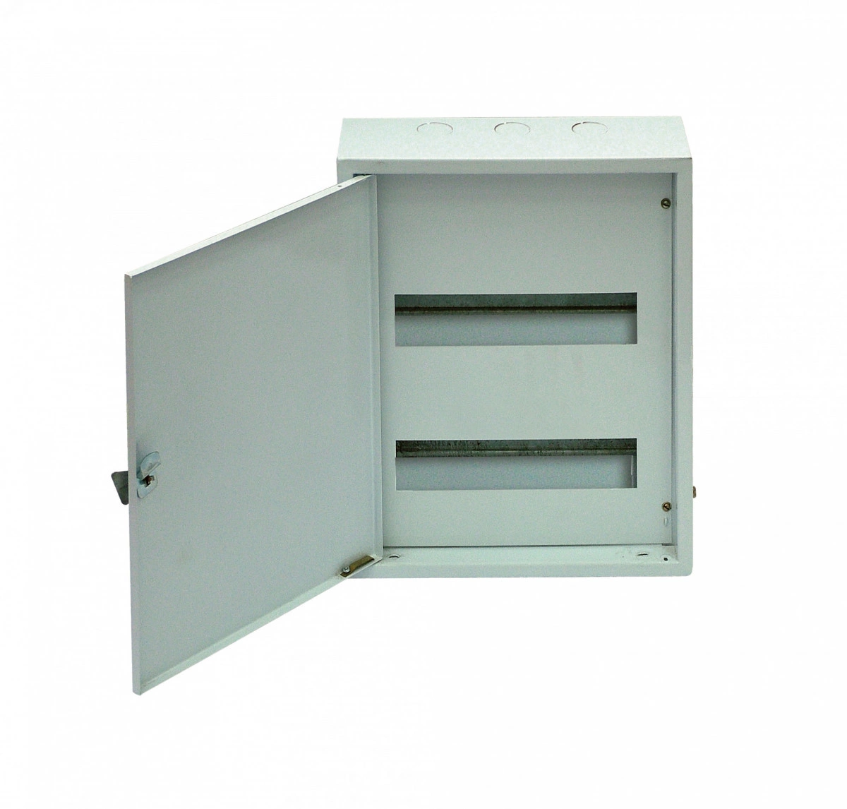 Щит распределения, навесной, с цельнометаллической дверкой, 24 модулей, установлены 2 шины по 22 отверстия. Отличительной особенностью корпусов распределения является применение омедненных шпилек вместо болтов в узлах заземления. Комплектуются фальш-панелью, DIN-рейками, а также шинами N и PE. Степень защиты корпусов не менее IP 31, а при открытой дверце IP 20 это позволяет устанавливать щиты в местах, доступных неквалифицированному персоналу. Порошковая окраска RAL 7035