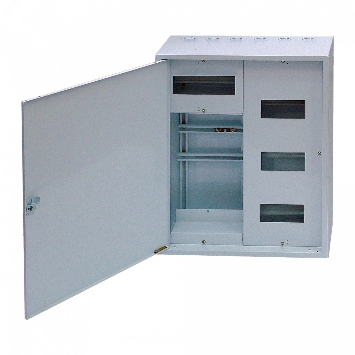 Щиток навесной с цельнометаллической дверкой, под индукционный счетчик, до 24 модулей. Корпус окрашивается порошковой краской уличного исполнения У1, дверцы корпусов могут быть как цельнометаллическими, так и спрозрачным элементом, что позволяет снимать показания со счетчика не прибегая к открыванию дверцы.Степень защиты корпусов IP 54.