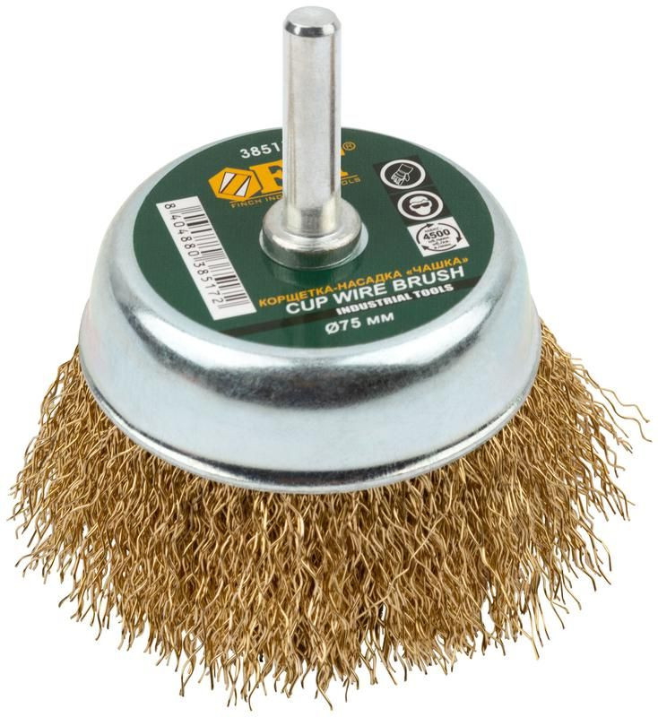 Полное описание: Корщетка-чашка со штифтом стальная латунированная волнистая проволока 75мм FIT 38517