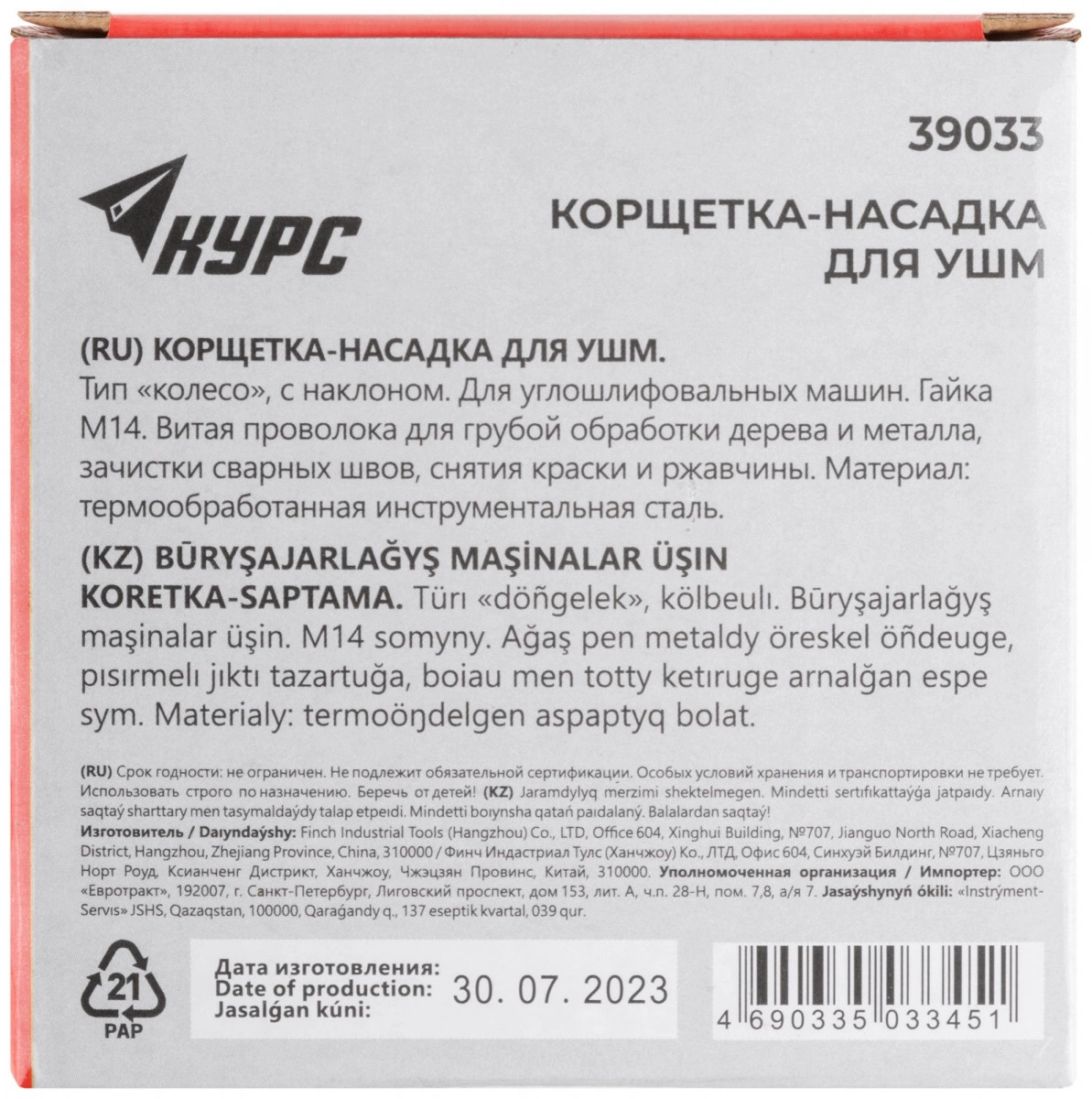 Корщетки-насадки для УШМ КУРС типа ''колесо'' с наклоном предназначены для грубой обработки дерева и металла, зачистки сварных швов, удаления краски и ржавчины. Стальная витая проволока толщиной 0,5 мм обеспечивает высокую скорость и эффективность работы. Корщетки типа ''колесо'' с наклоном наиболее эффективны при обработке стыков, углов, пазов и различных труднодоступных мест. Порошковое покрытие корпуса и масляное покрытие проволоки предотвращают коррозию. Гайка с резьбой М14 обеспечивает прочную фиксацию на УШМ.