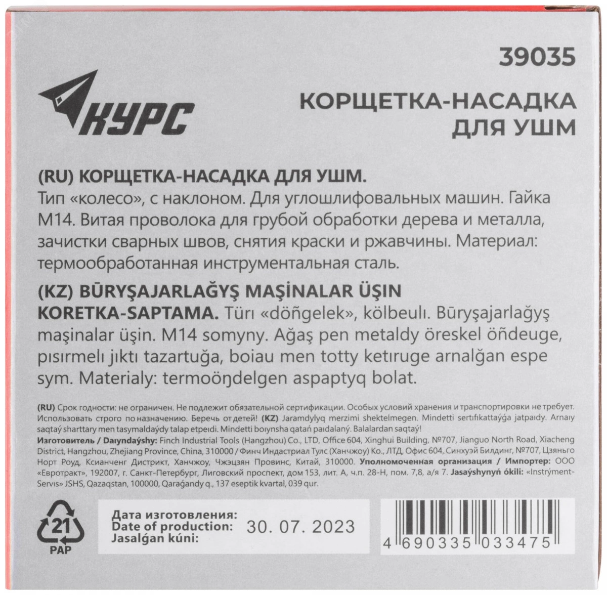 Корщетки-насадки для УШМ КУРС типа ''колесо'' с наклоном предназначены для грубой обработки дерева и металла, зачистки сварных швов, удаления краски и ржавчины. Стальная витая проволока толщиной 0,5 мм обеспечивает высокую скорость и эффективность работы. Корщетки типа ''колесо'' с наклоном наиболее эффективны при обработке стыков, углов, пазов и различных труднодоступных мест. Порошковое покрытие корпуса и масляное покрытие проволоки предотвращают коррозию. Гайка с резьбой М14 обеспечивает прочную фиксацию на УШМ.