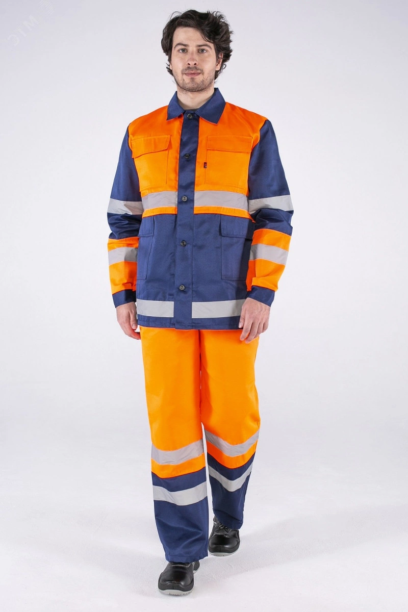 Особенности - комбинированная с отложным воротником и центральной застежкой на петли и пуговицы, нагрудные и боковые карманы с клапанами, фиксирующимися на ленте 'велькро', полукомбинезон комбинированный прямого силуэта, глубокие боковые карманы и нагрудный с клапаном, фиксирующимся на ленте 'велькро', широкие светоотражающие полосы на куртке. Полукомбинезон - регулирующиеся по длине брители, боковые карманы, нагрудный карман с клапаном, СОП по низу брючин.