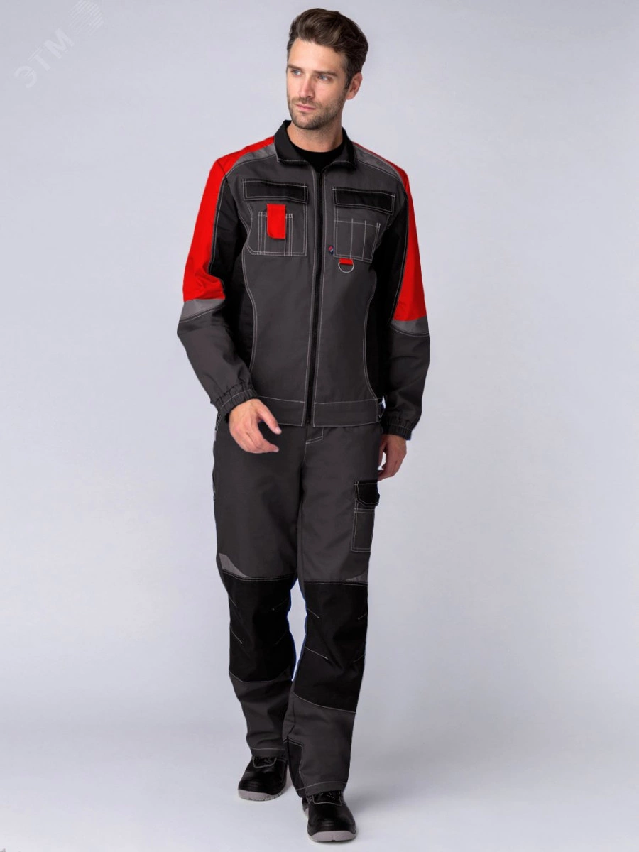 Костюм мужской рабочий 'Формула' изготовлен в соответствии с ГОСТ и включает в себя два предмета - рабочая куртка мужская и брюки рабочие. Укороченная куртка удобно застегивается на молнию, оснащена поясом с регулировкой по ширине. Для безопасной работы в местах с плохим освещением предусмотрены светоотражающие полосы. Благодаря яркой контрастной отделке рабочая форма заметна издалека даже днем. Боковые и нагрудные карманы с клапаном на липучке предназначены для записей и мелочей. Рабочие брюки усилены дополнительной тканью в районе коленей и шагового шва снизу. Под накладной карман входит карман для инструментов с настроченным малым накладным карманом, входящий в боковой шов, по шаговому шву на уровне низа изделия настрачиваются усиливающие накладки из отделочной ткани.