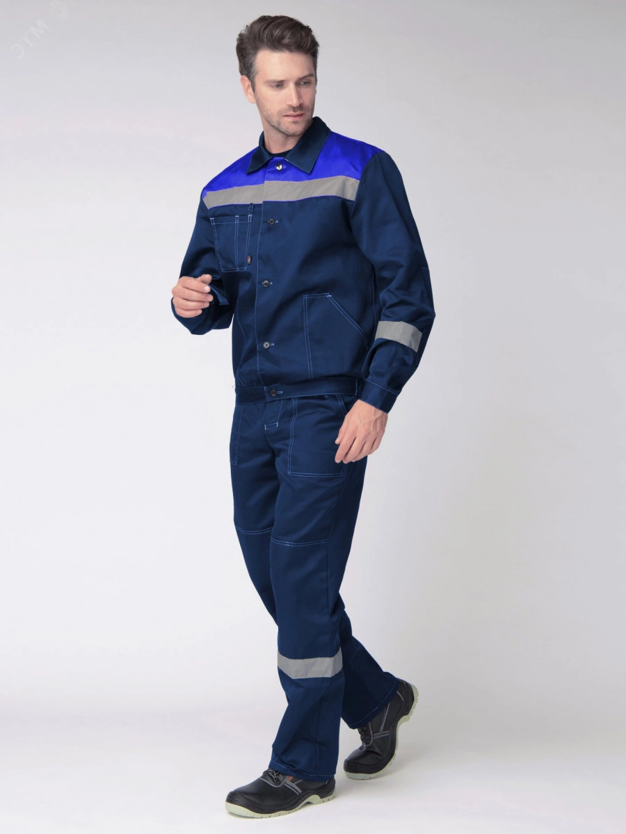 Рабочий костюм 'Легион-1 СОП', состоящий из двух предметов (рабочая мужская куртка на пуговицах и рабочие брюки), оснащен широкими светоотражающими полосами 50 мм для безопасной работы в местах с плохим освещением. Благодаря усилению плечевого и шагового шва, а также усилительным накладкам в области колен и локтей униформа отличается повышенной надежностью, износостойкостью и длительным периодом эксплуатации. Костюм рабочий изготовлен по ГОСТ, с изнаночной стороны брюк и куртки расположены этикетки для указания ФИО. Летняя рабочая куртка прямого кроя с регулировкой по объему на поясе не стесняет движения, очень удобна в работе. Для хранения записей предусмотрен нагрудный карман с лентой для фиксации бейджа и отделением под ручку. Рабочие брюки с карманами застегиваются на пуговицы, а также могут фиксироваться ремнем для дополнительного удобства.