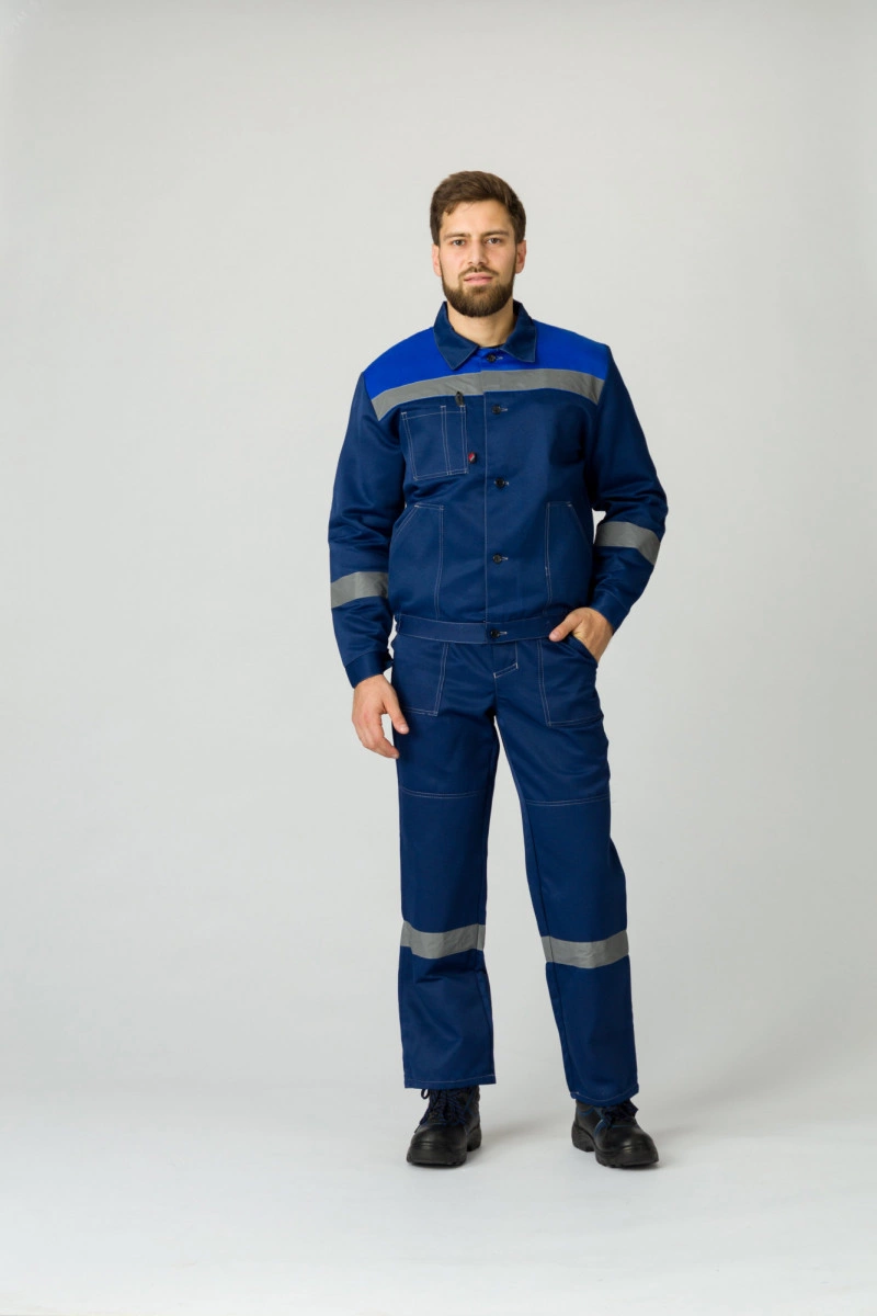Рабочий костюм 'Легион-2 СОП', изготовленный в соответствии с ГОСТ, включает в себя два предмета - рабочая мужская куртка на пуговицах и полукомбинезон рабочий. Спецодежда мужская оснащена широкими светоотражающими полосами для безопасной работы в местах с плохим освещением. Благодаря усилительным накладкам в области колен и локтей, а также усилению плечевого и шагового шва, униформа отличается повышенной надежностью и износостойкостью. Рабочая куртка прямого кроя с регулировкой по объему на поясе не стесняет движения, очень удобна в работе. Для хранения записей предусмотрен нагрудный карман с отделением под ручку. Рабочий полукомбинезон дополняется бретелями с регулировкой по длине и кулиской на резинке, благодаря чему подходит мужчинам разной комплекции. На груди располагается закрывающийся на липучку карман, гульфик застегивается на пуговицы.