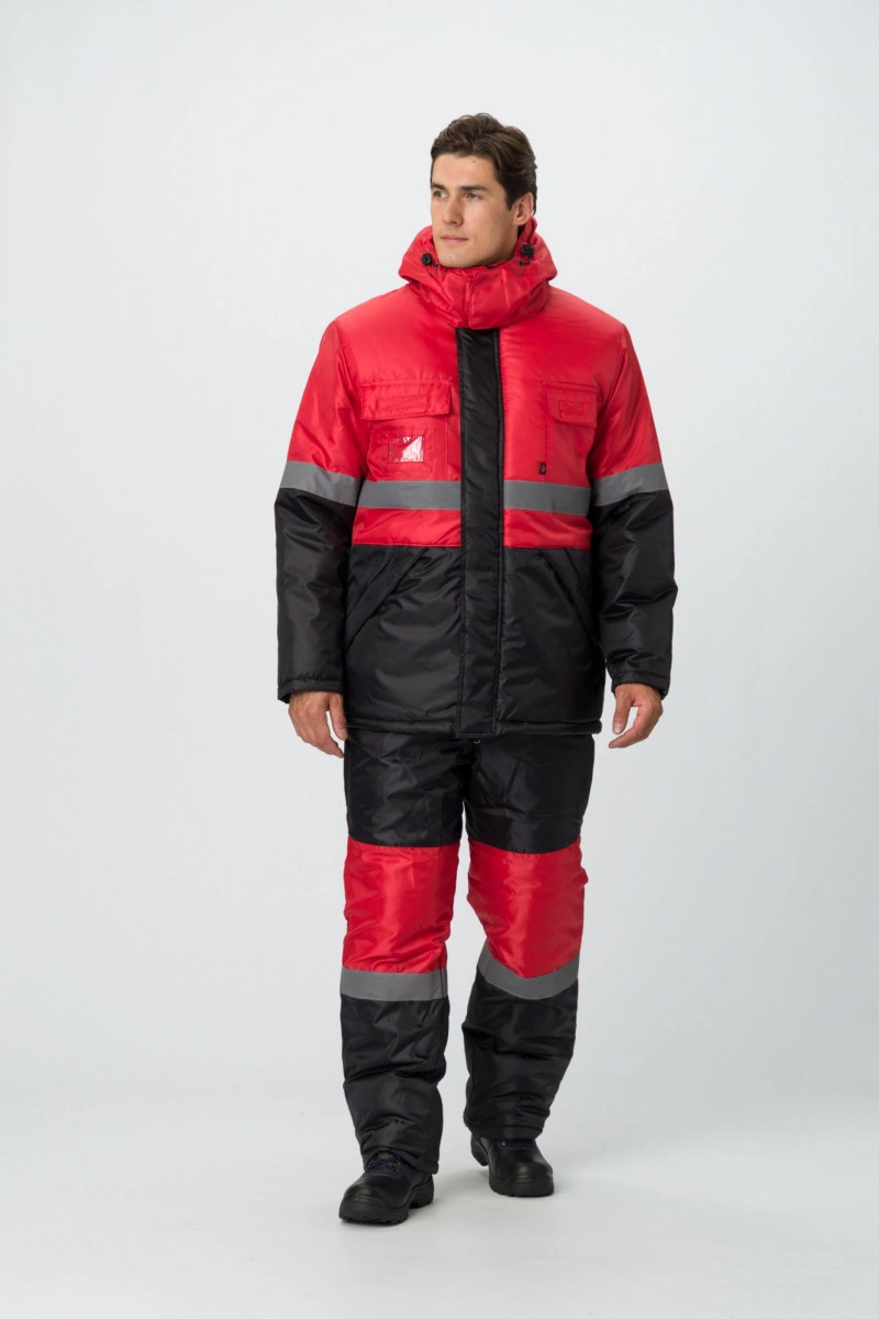 Особенности - центральная застежка на молнию, двойная утепленная ветрозащитная планка на липучках, регулируемый съемный утепленный капюшон, накладные нагрудные карманы с клапанами, прорезные боковые карманы на молнии, регулировка объема по линии талии, манжеты с эластичной тесьмой, на грудке карман для бейджа, флисовый внутренний воротник, СОП 50 мм. Полукомбинезон - на регулируемых по длине бретелях, центральная застежка-молния, два передних накладных кармана, СОП 50 мм по низу брюк.
