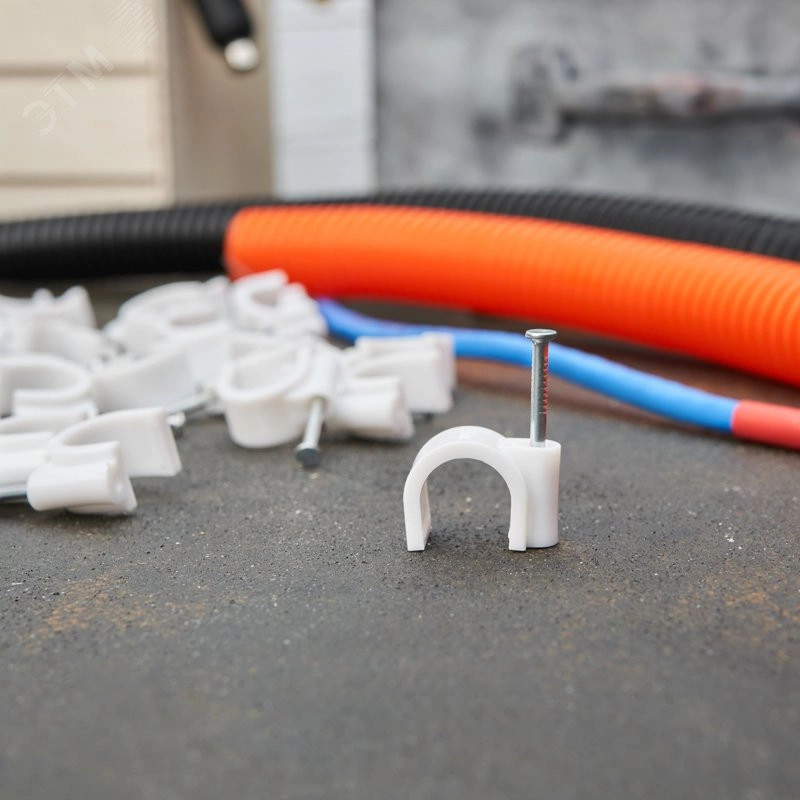 Круглый крепеж 14 мм с гвоздем предназначен для фиксации круглого кабеля к деревянной поверхности. Такой крепеж будет особенно полезен для использования на даче или в частном деревянном доме. Представляет собой дугообразную скобу белого цвета, выполненную из качественного пластика, с гвоздем в специальном отверстии. Скоба используется для мгновенного и надежного крепления проводов и кабелей к поверхностям стен, несущих конструкций и потолков. Гвоздь выполнен из закаленной стали, что позволяет закрепить его даже в плотной и твердой древесине без риска погнуть или сломать.