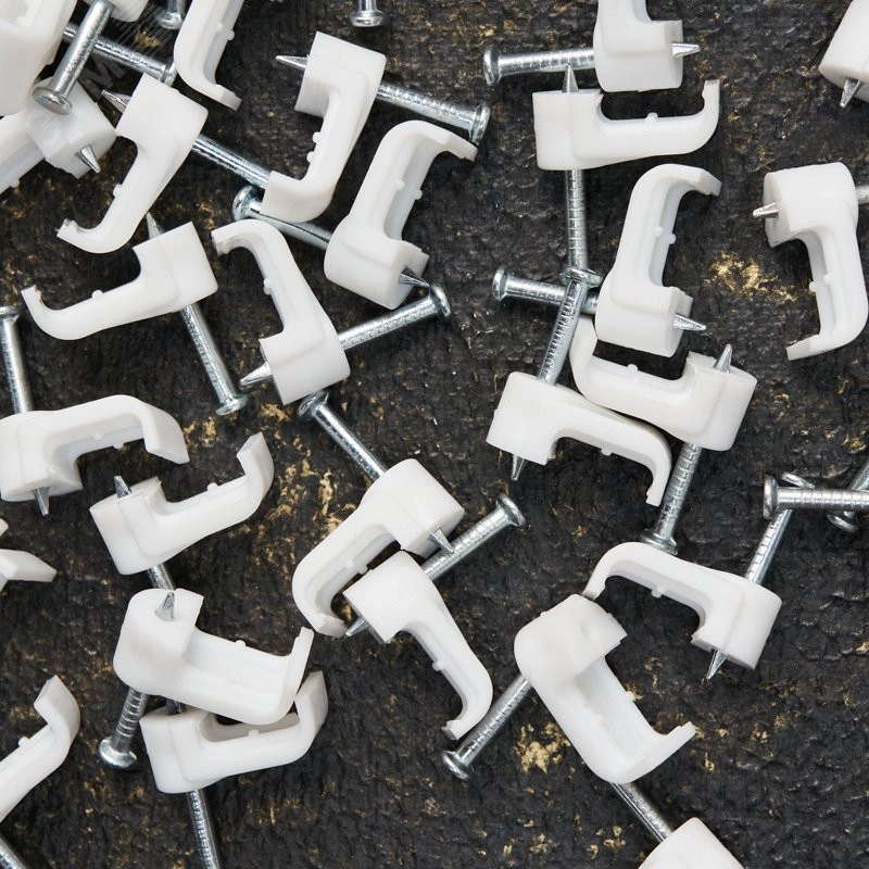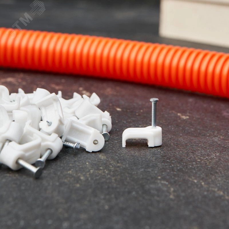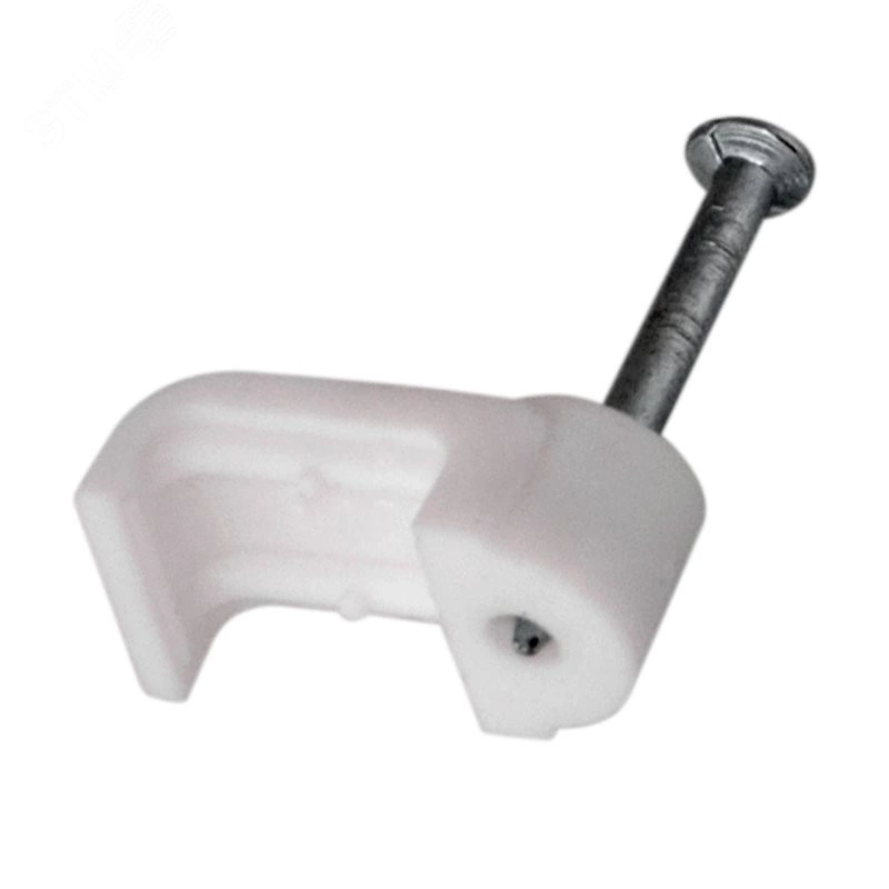 Плоский крепеж 10х3 мм с гвоздем предназначен для фиксации плоского кабеля к деревянной поверхности. Такой крепеж будет особенно полезен для использования на даче или в частном деревянном доме. Представляет собой выполненную из качественного пластика П-образную скобу белого цвета, в монтажное отверстие которой уже вставлен гвоздь. Скоба используется для мгновенного и надежного крепления проводов и кабелей к поверхностям стен, несущих конструкций и потолков. Гвоздь выполнен из закаленной стали, что позволяет закрепить его даже в плотной и твердой древесине без риска погнуть или сломать.