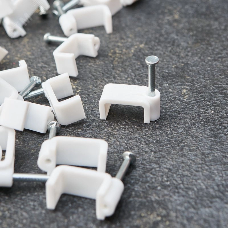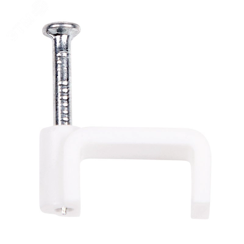Плоский крепеж 14х7 мм с гвоздем предназначен для фиксации плоского кабеля к деревянной поверхности. Такой крепеж будет особенно полезен для использования на даче или в частном деревянном доме. Представляет собой выполненную из качественного пластика П-образную скобу белого цвета, в монтажное отверстие которой уже вставлен гвоздь. Скоба используется для мгновенного и надежного крепления проводов и кабелей к поверхностям стен, несущих конструкций и потолков. Гвоздь выполнен из закаленной стали, что позволяет закрепить его даже в плотной и твердой древесине без риска погнуть или сломать.