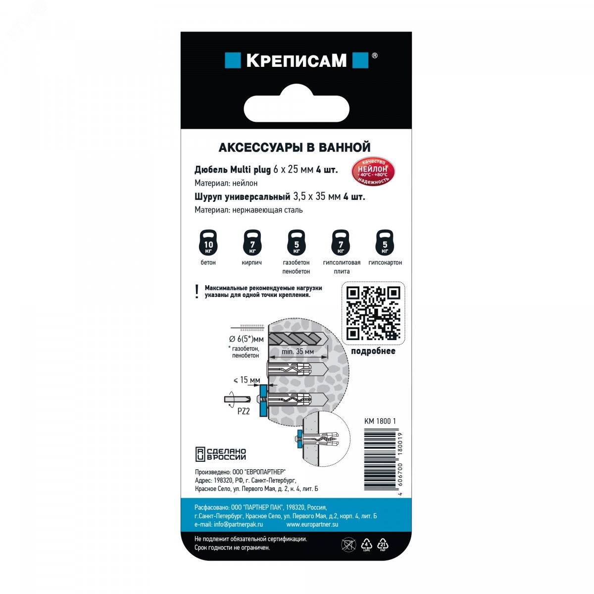Комплект для крепления аксессуаров в ванной комнате с дюбелем Multi plug в комплекте позволяет осуществлять монтаж в любые материалы основания. Шестигранная форма дюбеля предотвращает его прокручивание в отверстии в момент установки, а широкий, но тонкий, бортик исключает продавливание в материал основания. Дюбель работает с любыми крепежными элементами с широким диапазоном типоразмеров: шурупы, винты, крюки, петли, гвозди. Монтаж: просверлите отверстие диаметром 6 мм. (5 мм. для пено и газобетона), губиной не менее 35 мм., прочистите отверстие от буровой муки, установите дюбель до упора, закрутите шуруп сквозь прикрепляемый материал.