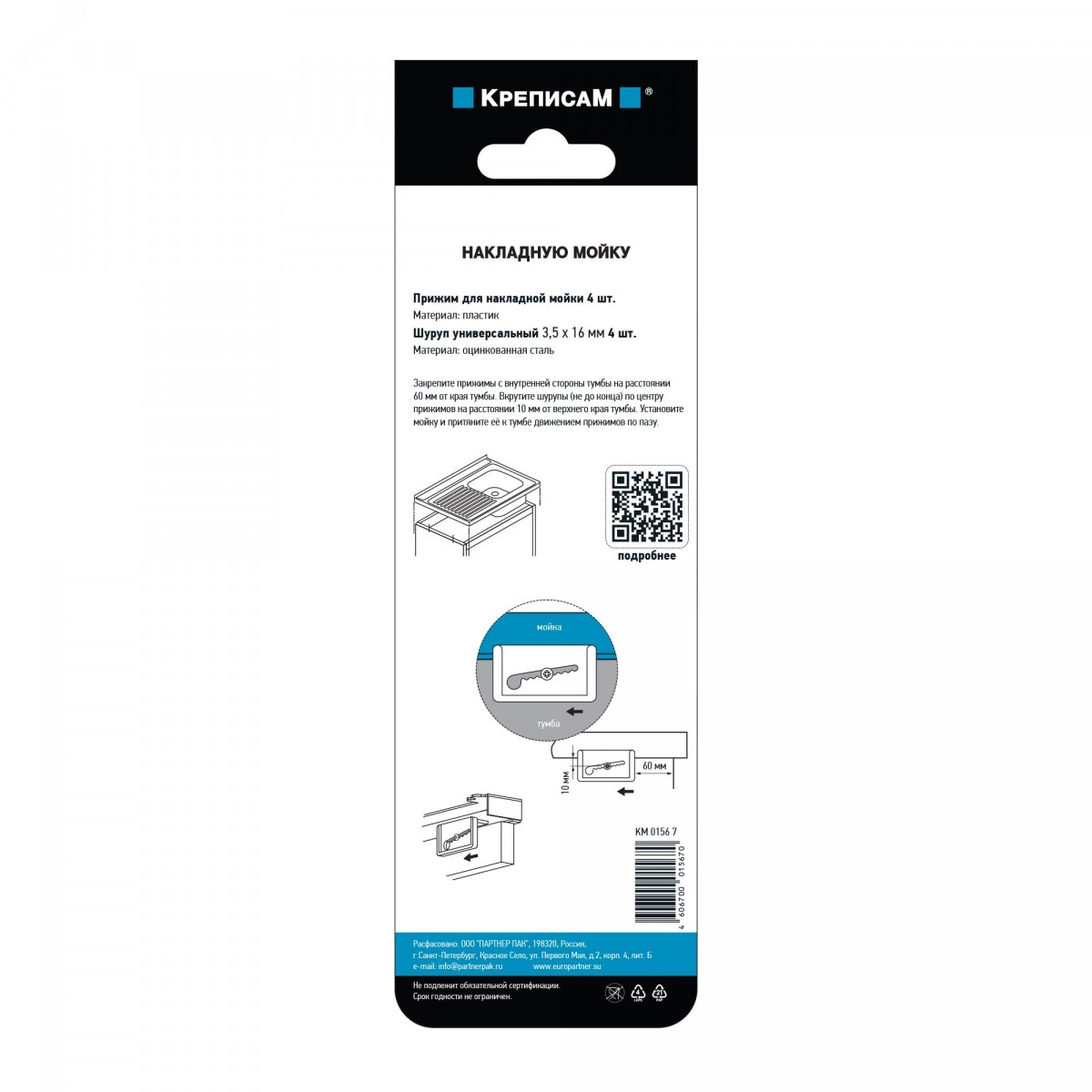 Универсальный набор креплений для накладных моек к тумбе. Комплектация: Крепление (прижим) для мойки 4 шт, шуруп универсальный 3,5х16 мм. потай. 4 шт. Рекомендации по монтажу: Закрепите прижимы с внутренней стороны тумбы на расстоянии 60 мм от края тумбы. Вкрутите шурупы (не до конца) по центру прижимов на расстоянии 10 мм от верхнего края тумбы. Установите мойку и притяните её к тумбе движением прижимов по пазу.
