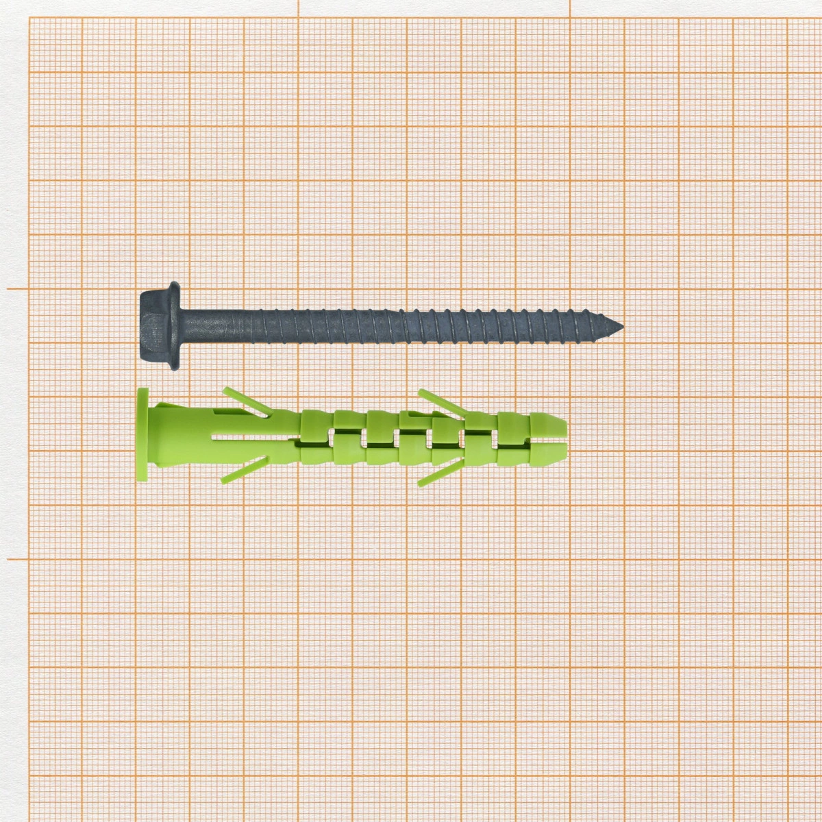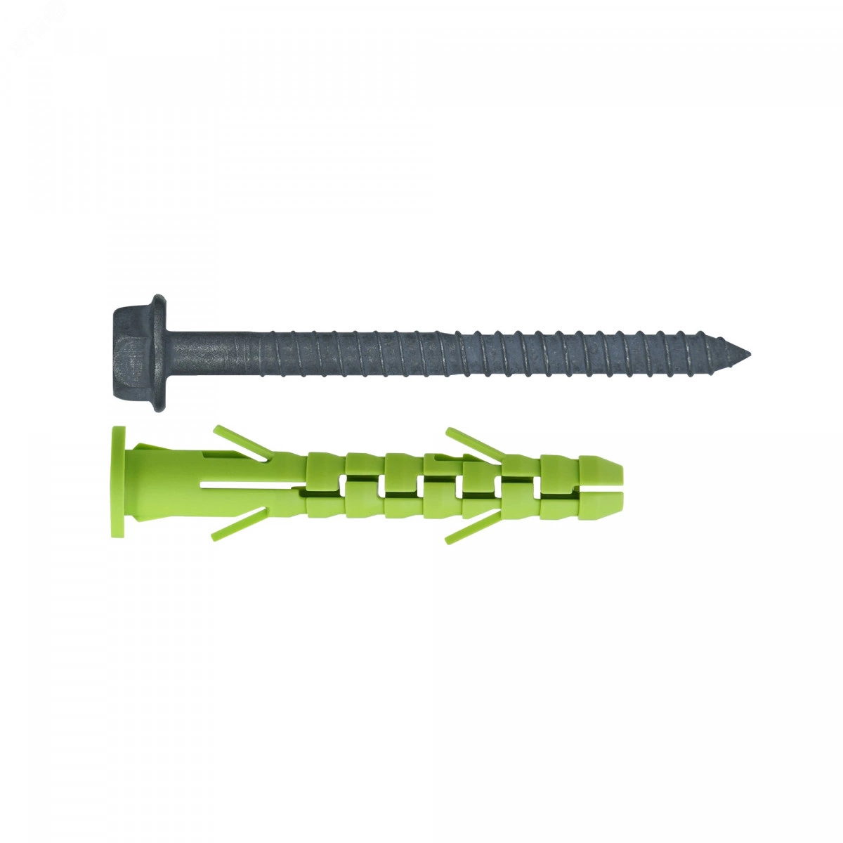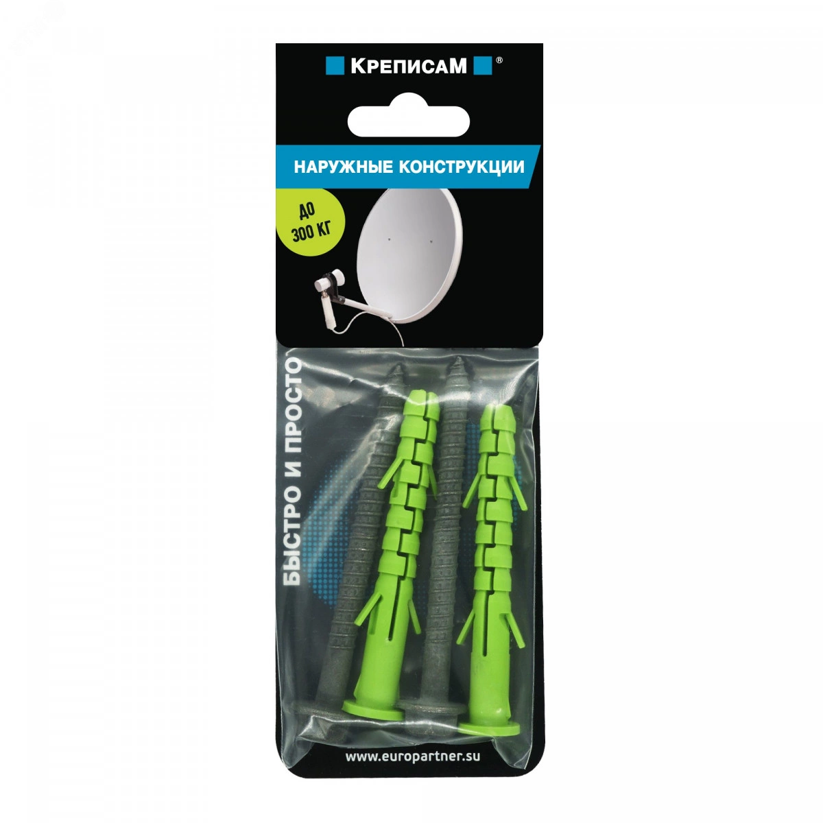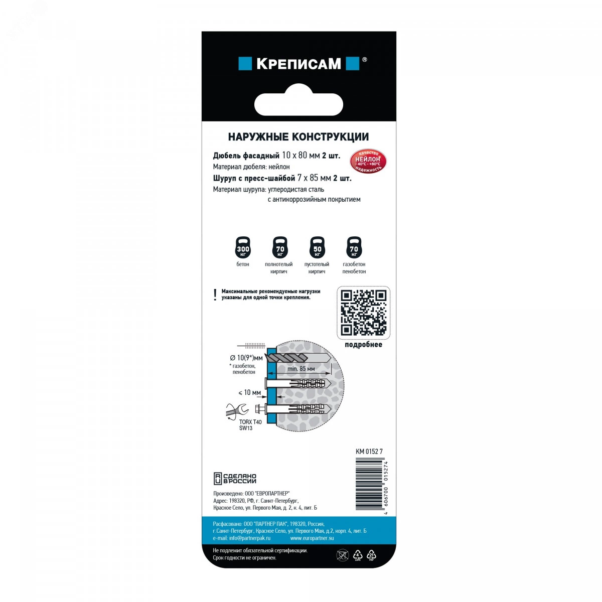 Комплект для крепления наружных конструкций предназначен для сквозного монтажа элементов фасадных конструкций в твердые и пористые (пено и газобетон) материалы. Дюбель изготовлен из нейлона, шуруп из углеродистой стали с низкотемпературной антикоррозийной обработкой методом термодиффузии и цинковым покрытием. Монтаж: просверлите отверстие диаметром 10 мм. (9 мм. для пено и газобетона, глубиной не менее 85 мм., прочистите отверстие от буровой муки, установите дюбель до упора, закрутите шуруп сквозь прикрепляемый материал.