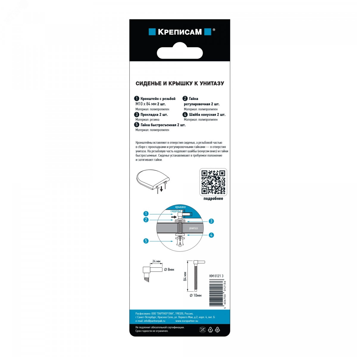 Кронштейны вставляют в отверстия сиденья, а резьбовой частью в сборе с прокладками в отверстие унитаза. На резьбовую часть надевают шайбы (конусом вниз) и гайки быстросъемные. Сиденье устанавливают в требуемое положение и затягивают гайки.