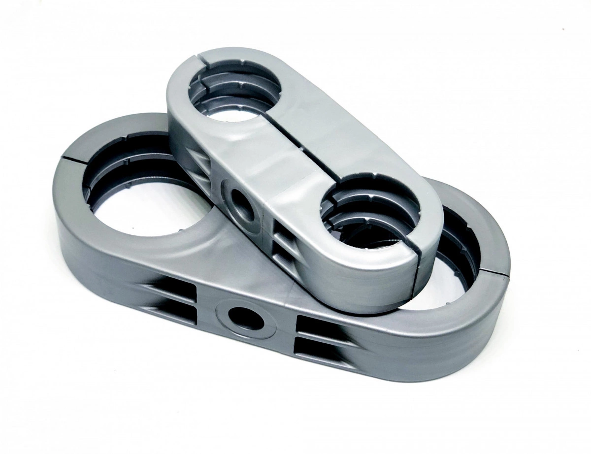Пластиковый трубный хомут предназначен для использования вместо традиционных металлических хомутов, с возможностью собирания крепления для труб в несколько уровней вплотную или разреженно (например, для использования толстостенного утеплителя) на одной шпильке на выбор (М6, М8, М10, М12).