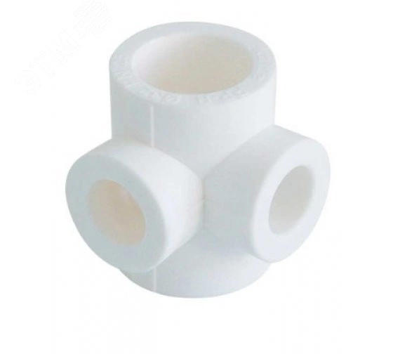 Полипропиленовый фитинг. Позволяет выполнять присоединение трубопроводов в двух взаимоперпендикулярных плоскостях труб разного диаметра. Монтаж производится методом раструбной сварки. Свариваемые поверхности – внутренние