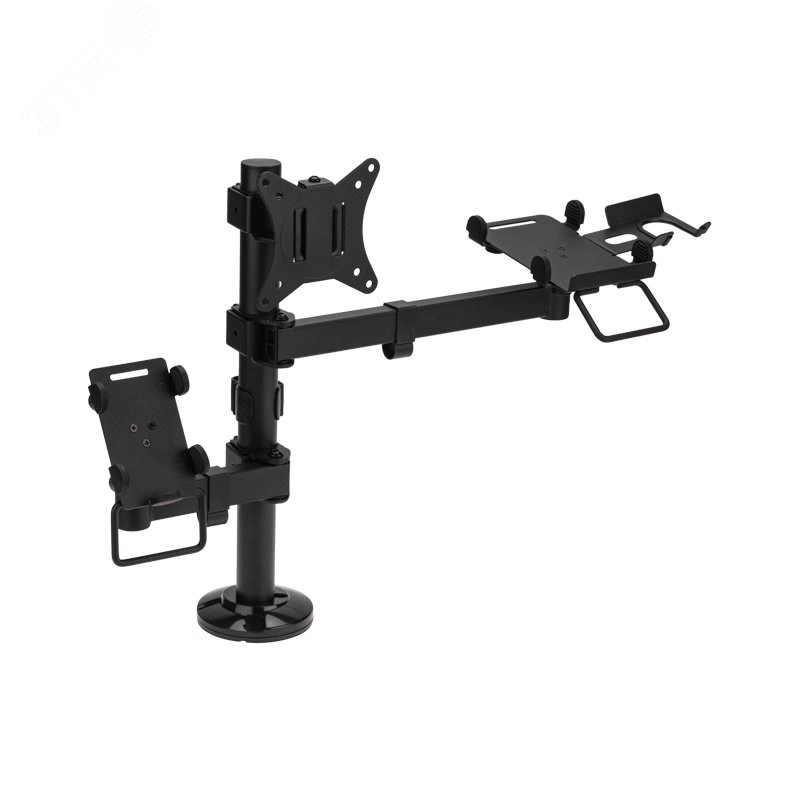 Кронштейн используется для фиксации кассового оборудования с одним монитором (POS-терминала, монитора, принтера чеков, сканера штрихкодов/баркодов). Благодаря возможности регулировки угла наклона до -45/+45 град. и угла поворота до -90/+90 град., пользователю доступен широкий диапазон возможных положений для максимального удобства. Минимальная диагональ экрана монитора составляет 17 дюймов, максимальная – 32 дюйма. Максимальный вес монитора – 9 кг. Кронштейн оснащен системой укладки кабеля вдоль корпуса, которая позволяет аккуратно уложить кабель, и тем самым, предотвратить спутывание проводов. Предназначен для настольного монтажа, крепление на струбцине позволяет быстро и легко установить кронштейн на рабочем месте. Изделие поддерживает стандарты VESA 75х75 и 100х100. Цвет – черный.