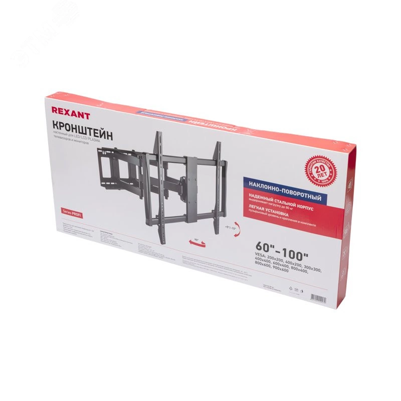Кронштейн REXANT серии Profi используется для крепления LED, LCD, PLASMA телевизоров 60 - 100 дюймов к стене. Оснащен наклонно-поворотным механизмом (с двойным коленом), который позволяет свободно регулировать положение телевизора, что обеспечивает комфортный и удобный просмотр вне зависимости от вашего расположения в комнате. В любой момент телевизор можно повернуть в нужную Вам сторону, выставить необходимый угол наклона и избежать бликов при смене освещения. Конструкция механизма позволяет точно и надежно фиксировать заданное положение с максимальной точностью. Для обеспечения удобного и быстрого монтажа кронштейн оснащен встроенным пузырьковым уровнем. Расстояние от стены до кронштейна регулируется от 70 до 625 мм. Поддержка крепления стандарта VESA - 200x200, 400x200, 300x300, 400x400, 600x400, 800x400, 800x600, 900x600.