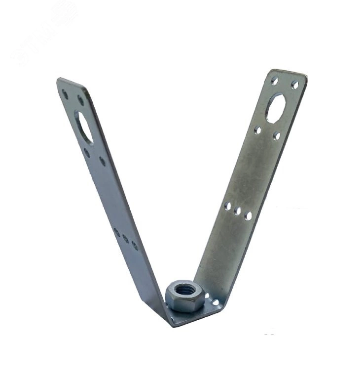 V-образный кронштейн крепится заклепками или самонарезными винтами к воздуховоду, а резьбовым стержнем к поверхности. Укомплектован сквозной гайкой для регулировки по высоте. В каждом V-кронштейне заранее определены места сгиба для максимальной приспособляемости к размерам канала. Гальваническое покрытие изделия - 8-10 мкм.