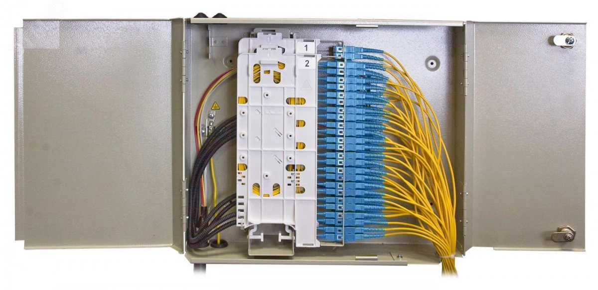 Настенные кроссы серии ШКОН-К предназначены для размещения в офисах, апаратных, помещениях связи и др. обслуживаемых помещениях. Кроссы ШКОН-К отличаются компактными размерами, а также удобством монтажа и обслуживания оптических волокон. Различные варианты исполнения кроссов ШКОН-К позволяют выбрать типоразмер и емкость, оптимальные для терминации ОК общей емкостью от 32 до 288 ОВ. Конструктивной особенностью кроссов является то, что монтаж и кросс-коммутация ОВ осуществляется в откидных кроссовых модулях, объединенных в кроссовый блок. Оптические кабели разделываются и фиксируются в зоне ввода. Далее волокна в транспортных трубках поступают в зону монтажа на соответствующий модуль. Кросс ШКОН-К-128(4)-96FC/UPC содержит четыре кроссовых модуля общей емкостью до 96 волокон.