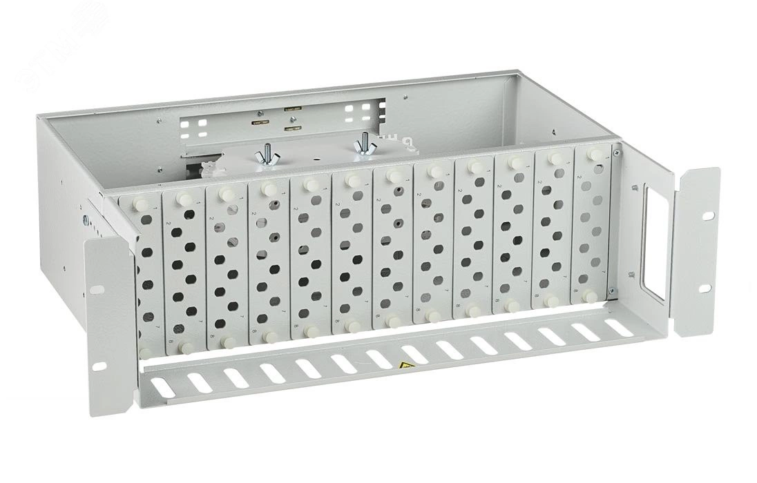 Предназначен для концевой заделки, распределения и коммутации оптических волокон волоконно-оптических кабелей, и устанавливается в стойках монтажных или шкафах телекоммуникационных типоразмера 19'', а при доукомплектации дополнительными кронштейнами в стойках и шкафах типоразмеров 21'' (ETSI) и 23''. Крепление кабеля по оболочке осуществляется металлическим хомутом и/или нейлоновыми стяжками, на специализированном кабельном вводе, который крепиться на задней стенке корпуса. Центральный силовой элемент ОК крепится при помощи металлической скобы. Сменные металлические планки на 8 или 4 отверстий обеспечивают установку адаптеров-розеток различных типов- FC, SC, ST, дуплекс LC. Комплектуется съёмным передним полкой-органайзером.