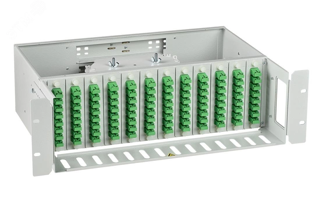 Предназначен для концевой заделки, распределения и коммутации оптических волокон волоконно-оптических кабелей, и устанавливается в стойках монтажных или шкафах телекоммуникационных типоразмера 19'', а при доукомплектации дополнительными кронштейнами в стойках и шкафах типоразмеров 21'' (ETSI) и 23''. Крепление кабеля по оболочке осуществляется металлическим хомутом и/или нейлоновыми стяжками, на специализированном кабельном вводе, который крепиться на задней стенке корпуса. Центральный силовой элемент ОК крепится при помощи металлической скобы. Сменные металлические планки на 8 или 4 отверстий обеспечивают установку адаптеров-розеток различных типов- FC, SC, ST, дуплекс LC. Комплектуется съёмным передним полкой-органайзером.