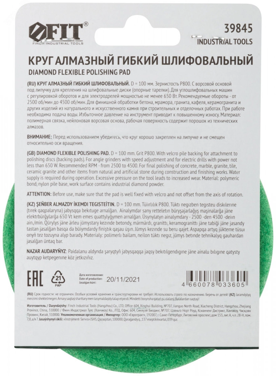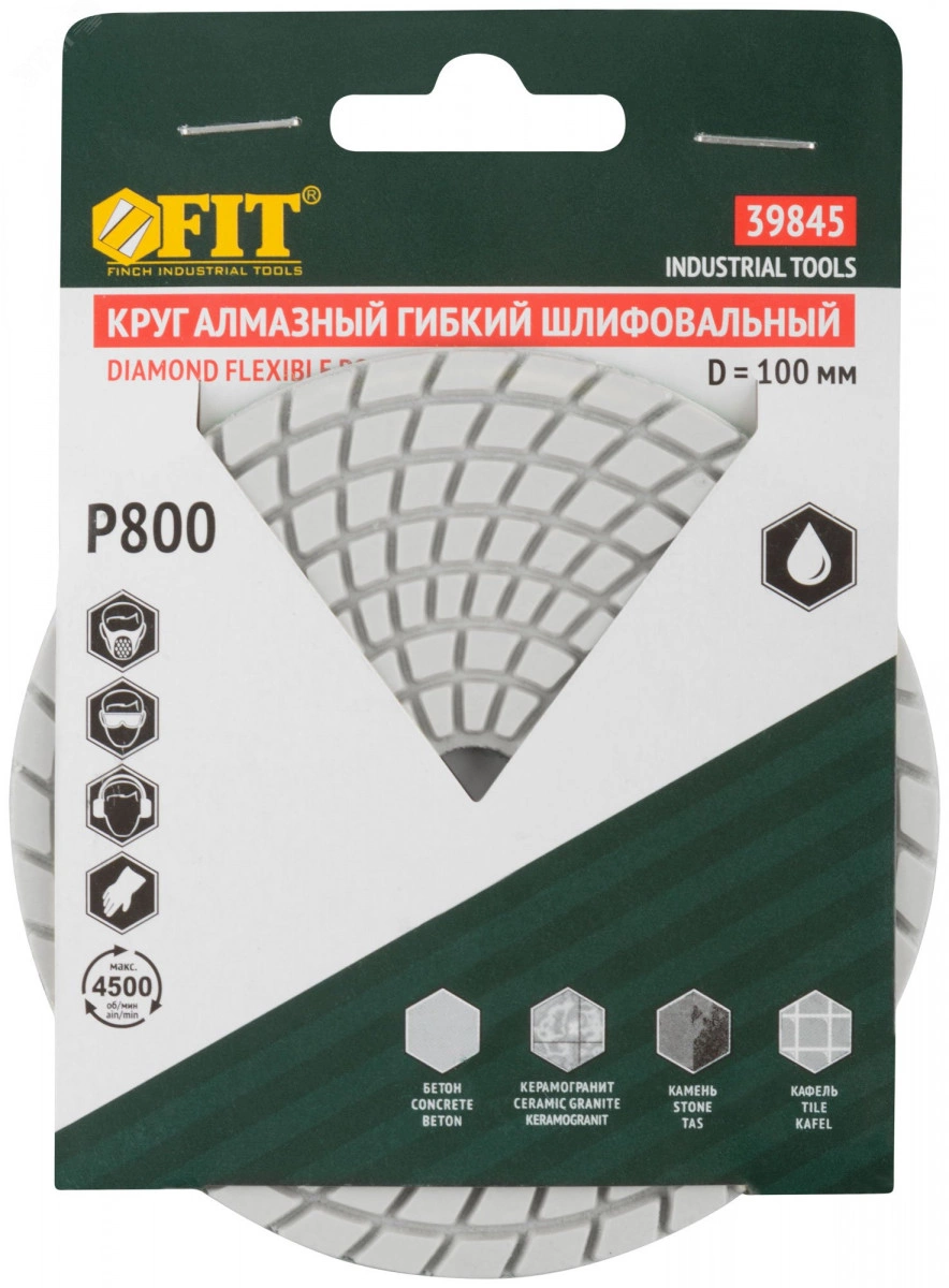 Алмазный гибкий шлифовальный круг FIT IT предназначен для шлифования и полирования бетона, мрамора, гранита, керамогранита, кафеля и других изделий. Также применяется для шлифования неровных краев керамической плитки после запила алмазным диском под углом 45 градусов. При работе необходима подача воды. Используется с УШМ с регулировкой оборотов и электродрелей мощностью не менее 650 Вт. За счет высокой концентрации алмазного зерна и полимерной связки круг полностью устойчив к коррозии и обладает высокой износостойкостью. Спиральный профиль рабочей части ускоряет процесс обработки материалов. Не изменяет цвет обрабатываемого материала в процессе работы. Высокая гибкость круга обеспечивает возможность обработки изделий различных форм. Ворсовая основа под липучку позволяет быстро устанавливать круг, способствует прочному удержанию на опорной тарелке и исключает его децентровку во время работы.