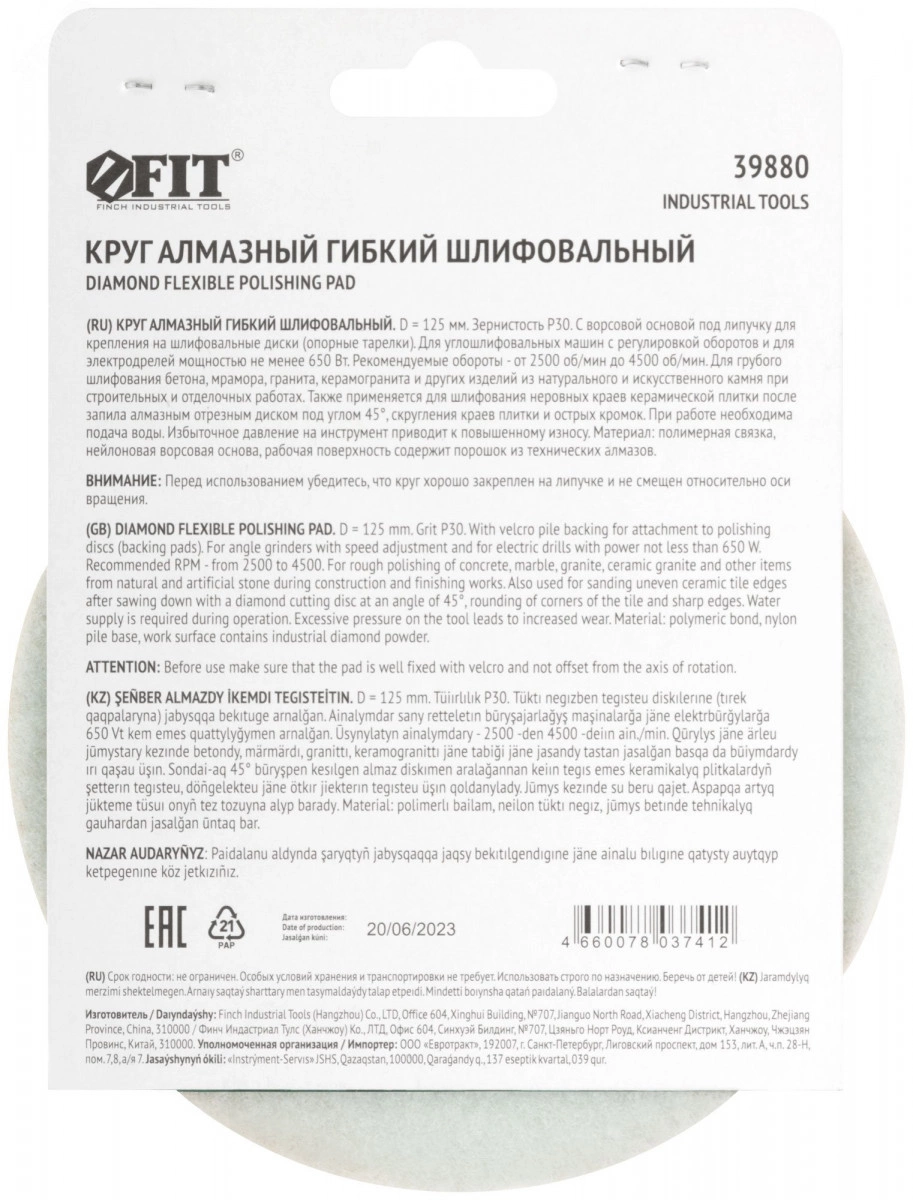 Алмазный гибкий шлифовальный круг FIT IT предназначен для шлифования и полирования бетона, мрамора, гранита, керамогранита, кафеля и других изделий. Также применяется для шлифования неровных краев керамической плитки после запила алмазным диском под углом 45 градусов. При работе необходима подача воды. Используется с УШМ с регулировкой оборотов и электродрелей мощностью не менее 650 Вт. За счет высокой концентрации алмазного зерна и полимерной связки круг полностью устойчив к коррозии и обладает высокой износостойкостью. Спиральный профиль рабочей части ускоряет процесс обработки материалов. Не изменяет цвет обрабатываемого материала в процессе работы. Высокая гибкость круга обеспечивает возможность обработки изделий различных форм. Ворсовая основа под липучку позволяет быстро устанавливать круг, способствует прочному удержанию на опорной тарелке и исключает его децентровку во время работы.