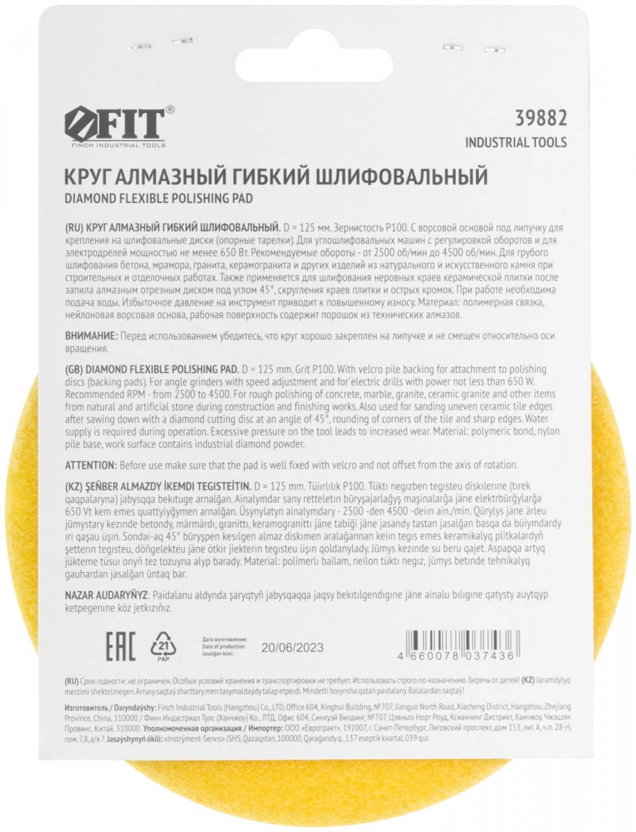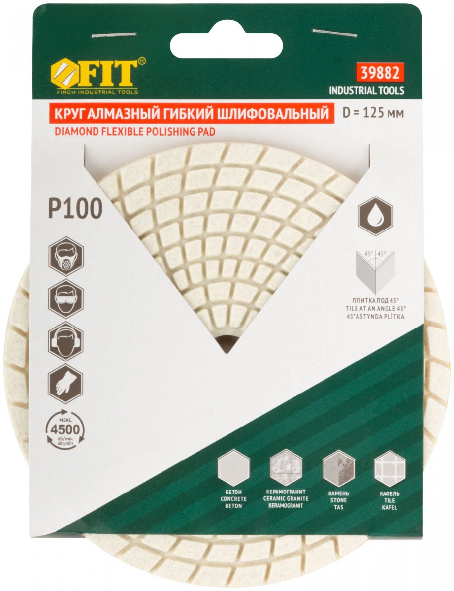 Алмазный гибкий шлифовальный круг FIT IT предназначен для шлифования и полирования бетона, мрамора, гранита, керамогранита, кафеля и других изделий. Также применяется для шлифования неровных краев керамической плитки после запила алмазным диском под углом 45 градусов. При работе необходима подача воды. Используется с УШМ с регулировкой оборотов и электродрелей мощностью не менее 650 Вт. За счет высокой концентрации алмазного зерна и полимерной связки круг полностью устойчив к коррозии и обладает высокой износостойкостью. Спиральный профиль рабочей части ускоряет процесс обработки материалов. Не изменяет цвет обрабатываемого материала в процессе работы. Высокая гибкость круга обеспечивает возможность обработки изделий различных форм. Ворсовая основа под липучку позволяет быстро устанавливать круг, способствует прочному удержанию на опорной тарелке и исключает его децентровку во время работы.