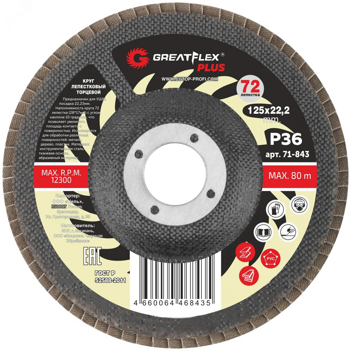 Круг лепестковый торцевой GreatFlex Plus (72 лепестка): 125 х 22,2 мм, P100