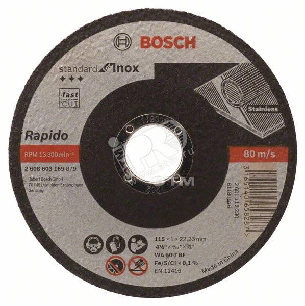 Отрезной диск Standard for Inox — надежный выбор для работ по нержавеющей стали. Диск сделан из оксида алюминия, специально разработанного для работы с нержавеющей сталью. В нем отсутствуют железистые, сернистые и хлористые наполнители. Диск используется для резки нержавеющей стали. Отрезные диски Bosch соответствуют самым высоким требованиям безопасности EN 12413. Подходит для угловых шлифовальных машин Bosch.