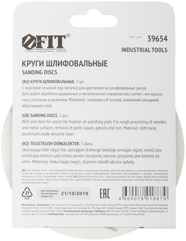 Полное описание: Круг шлифовальный сплошной (липучка) алюм./оксид 125мм Р 80 (уп.5шт) FIT 39654