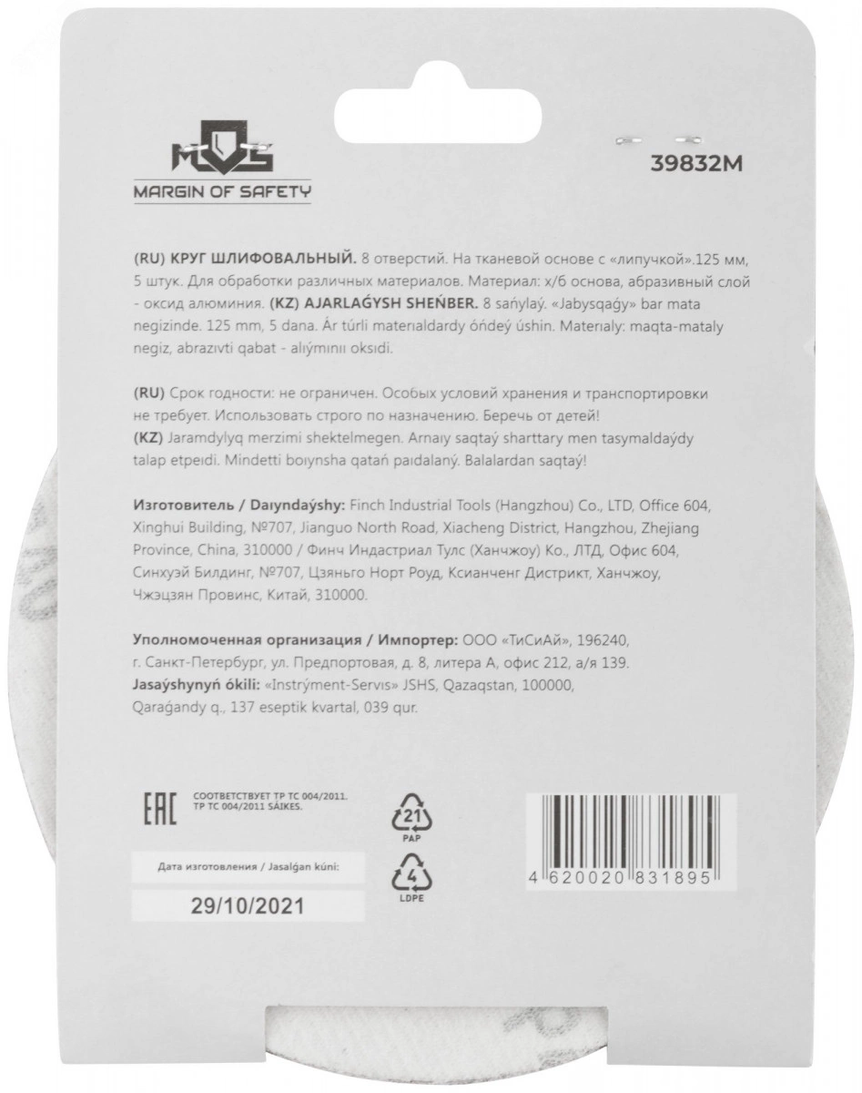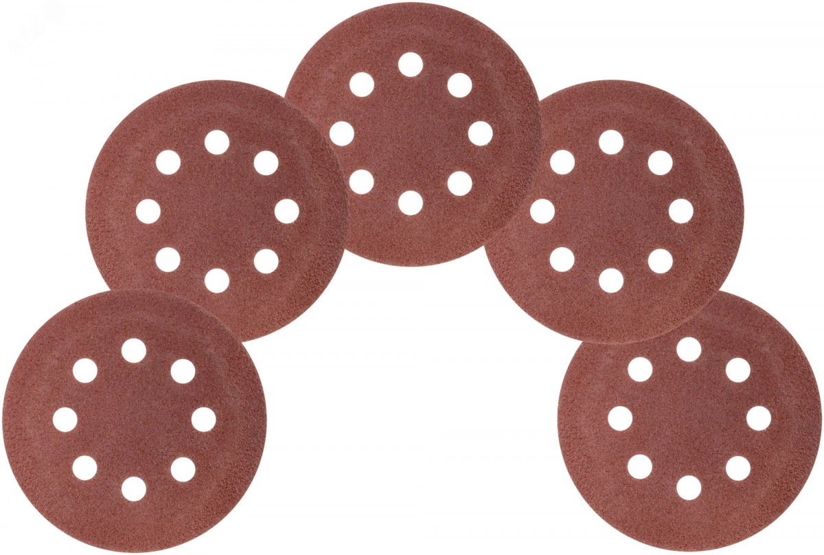 8 отверстий. На тканевой основе с 'липучкой'. Диаметр 125мм, набор 5 штук. Для обработки различных материалов. Материал - х/б основа, абразивный слой-оксид алюминия.