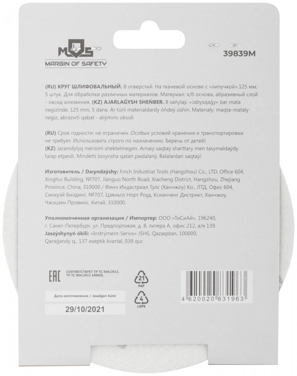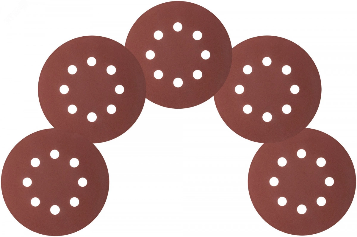 8 отверстий. На тканевой основе с 'липучкой'. Диаметр 125мм, набор 5 штук. Для обработки различных материалов. Материал - х/б основа, абразивный слой-оксид алюминия.