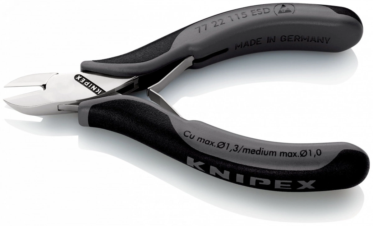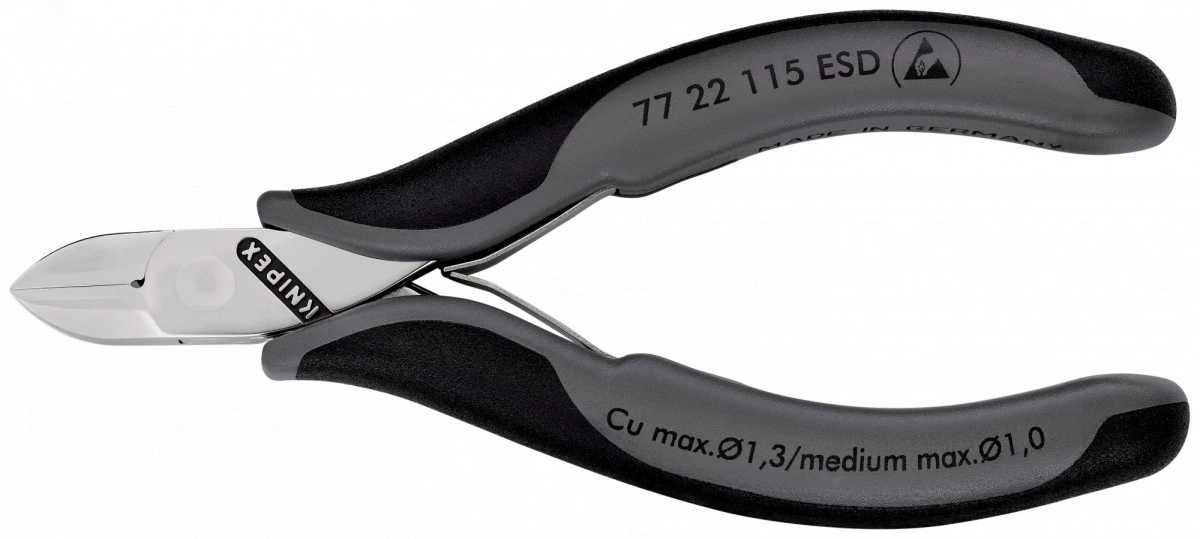 77 22 115 ESD Бокорезы для электроники антистатические для самых тонких работ по резке, например, в электронике и точной механике. ручки электроотводящие с рассеянием. устойчивый коробчатый безлюфтовый шарнир. плоская двуперая пружина с малым трением. финишная отделка - зеркальная полировка в сочетании с тонкой масляной пленкой обеспечивает хорошую защиту от коррозии. режущие кромки дополнительно закалены токами высокой частоты до твердости примерно 62 HRC. ручки с двухцветными многокомпонентными чехлами серо-черного цвета. скругленная головка, без фаски. Твёрдость режущих кромок примерно 57 HRC. - Параметры резания/проволока средней твёрдости (диаметр) - 1,0mm - Параметры резания/ мягкая проволока (диаметр) - 0,3?–?1,3mm - Длина губок (B) - 14mm - Толщина губки (шарнир) (D) - 7,5mm - Ширина головки (A) - 11mm - антистатический инструмент - да