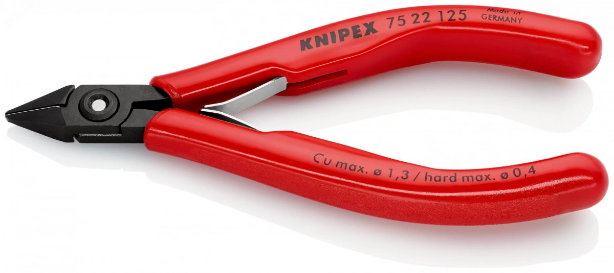 75 22 125 Бокорезы для электроники винтовой шарнир для высокой точности и больших нагрузок. для самых тонких монтажных работ, например, в электронике и точной механике. с острыми, отшлифованными лезвиями для мягкой и жесткой проволоки, а также рояльной струны. режущие кромки дополнительно закалены токами высокой частоты до твердости примерно 64 HRC. плоская двуперая пружина с малым трением. с маленькой фаской. - Параметры резания/проволока средней твёрдости (диаметр) - 0,9mm - Параметры резания/ твёрдая проволока (диаметр) - 0,4mm - Параметры резания/ рояльная струна (диаметр) - 0,3mm - Параметры резания/ мягкая проволока (диаметр) - 0,2?–?1,3mm - Длина губок (B) - 14mm - Толщина губки (шарнир) (D) - 6,5mm - Ширина головки (A) - 10,5mm