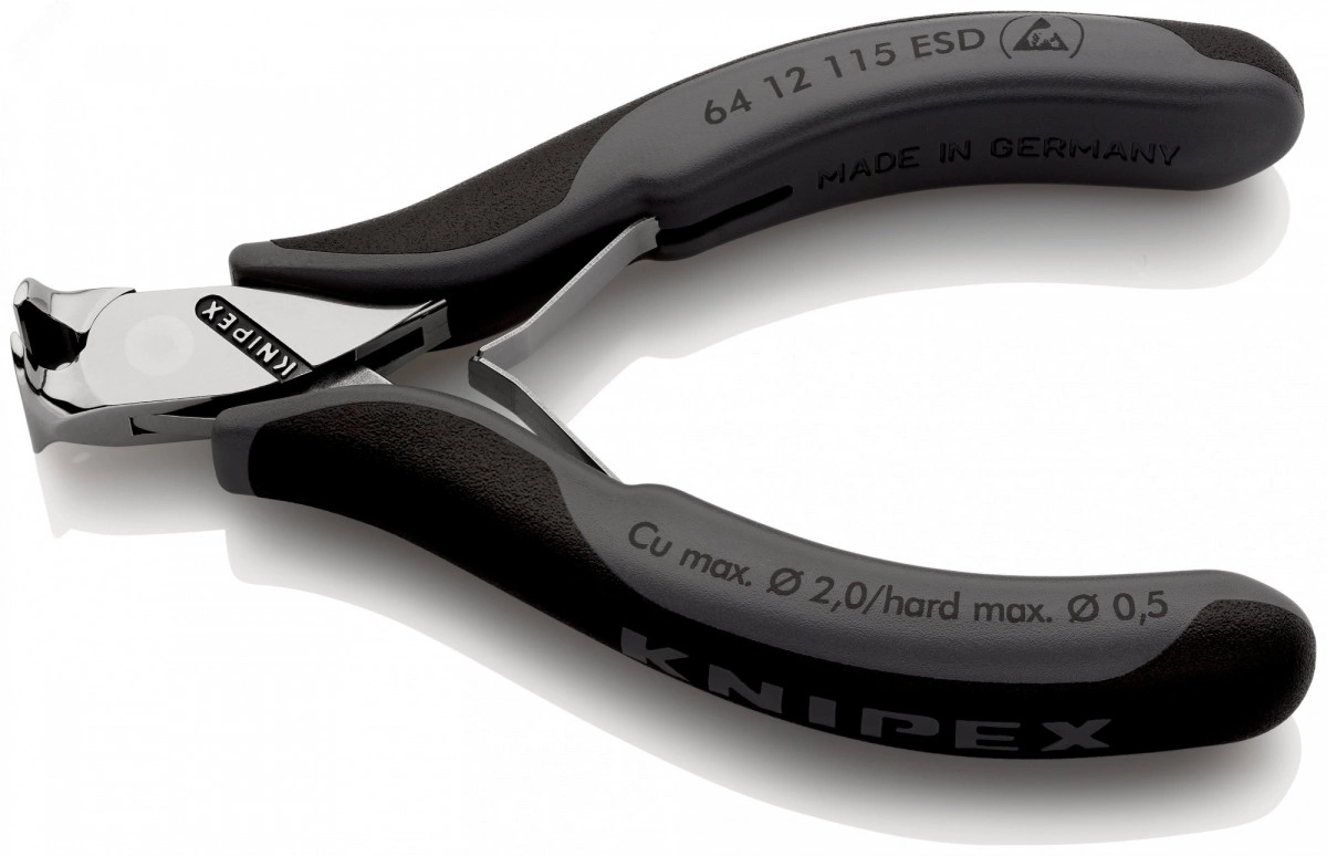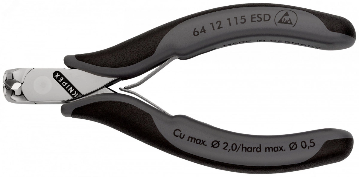 64 12 115 ESD Кусачки торцевые для электроники антистатические кусачки прецизионные для самых тонких работ по резанию, например, в электронике и точной механике. ручки электроотводящие с рассеянием. коробчатый прецизионный шарнир. плоская двуперая пружина с малым трением. финишная отделка - зеркальная полировка в сочетании с тонкой масляной пленкой обеспечивает хорошую защиту от коррозии. Лезвия с дополнительной лазерной закалкой, твёрдость не менее 56 HRC. ручки с двухцветными многокомпонентными чехлами серо-черного цвета. Кусачки торцевые, с маленькой фаской. - Параметры резания/ мягкая проволока (диаметр) - 1,4mm - Параметры резания/проволока средней твёрдости (диаметр) - 0,8mm - Ширина головки (A) - 11mm - Длина губок (B) - 6mm - Толщина губки (шарнир) (D) - 7mm - Длина резака в мм (C) - 16mm - антистатический инструмент - да